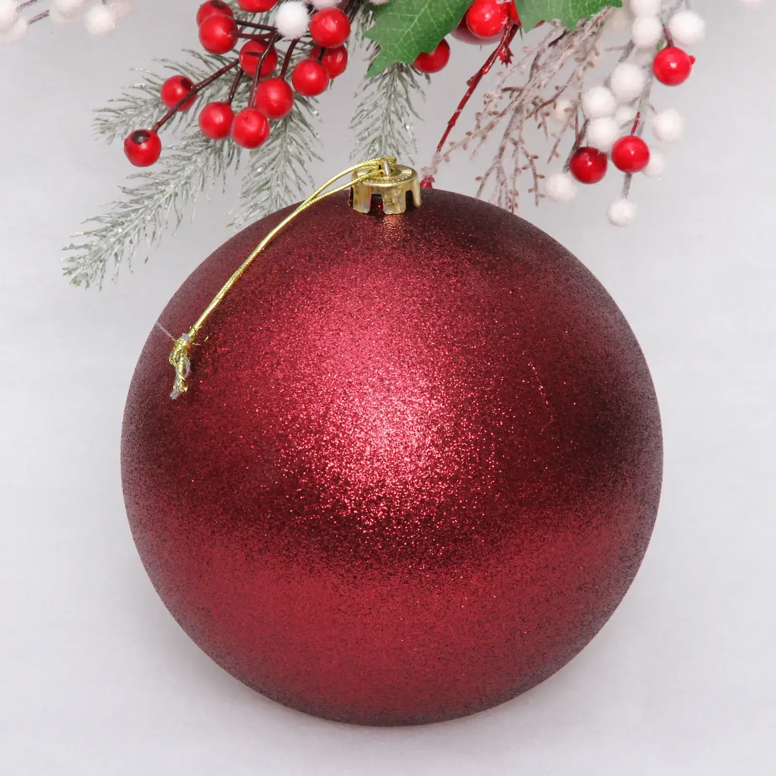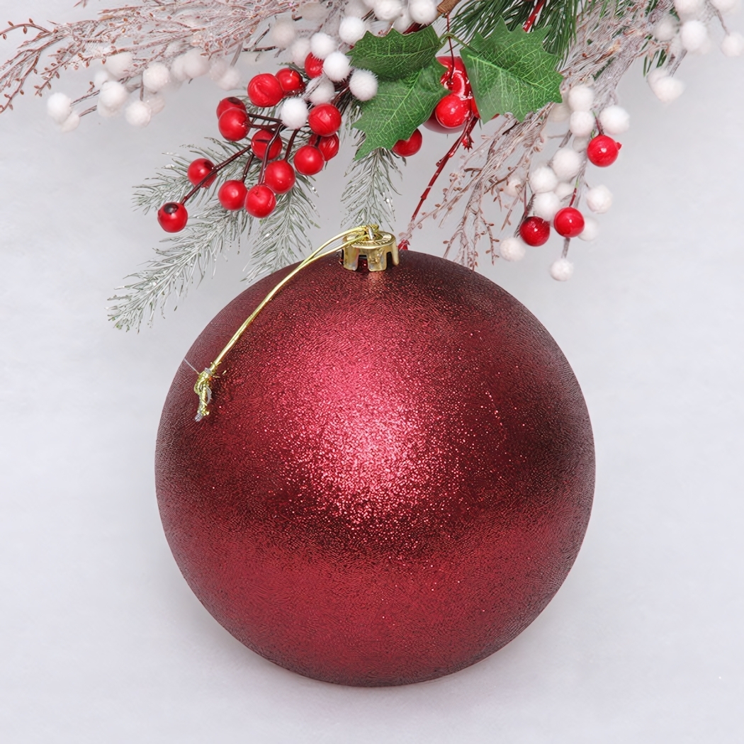 Размер шара составляет 20 см, что делает его заметным элементом декора. Ярко-красный цвет с глиттерным покрытием придаёт ему особую привлекательность. Используйте его в сочетании с другими шарами и декором, чтобы создать свою уникальную новогоднюю атмосферу. Не упустите возможность сделать ваш праздник незабываемым с помощью этого великолепного новогоднего шара!