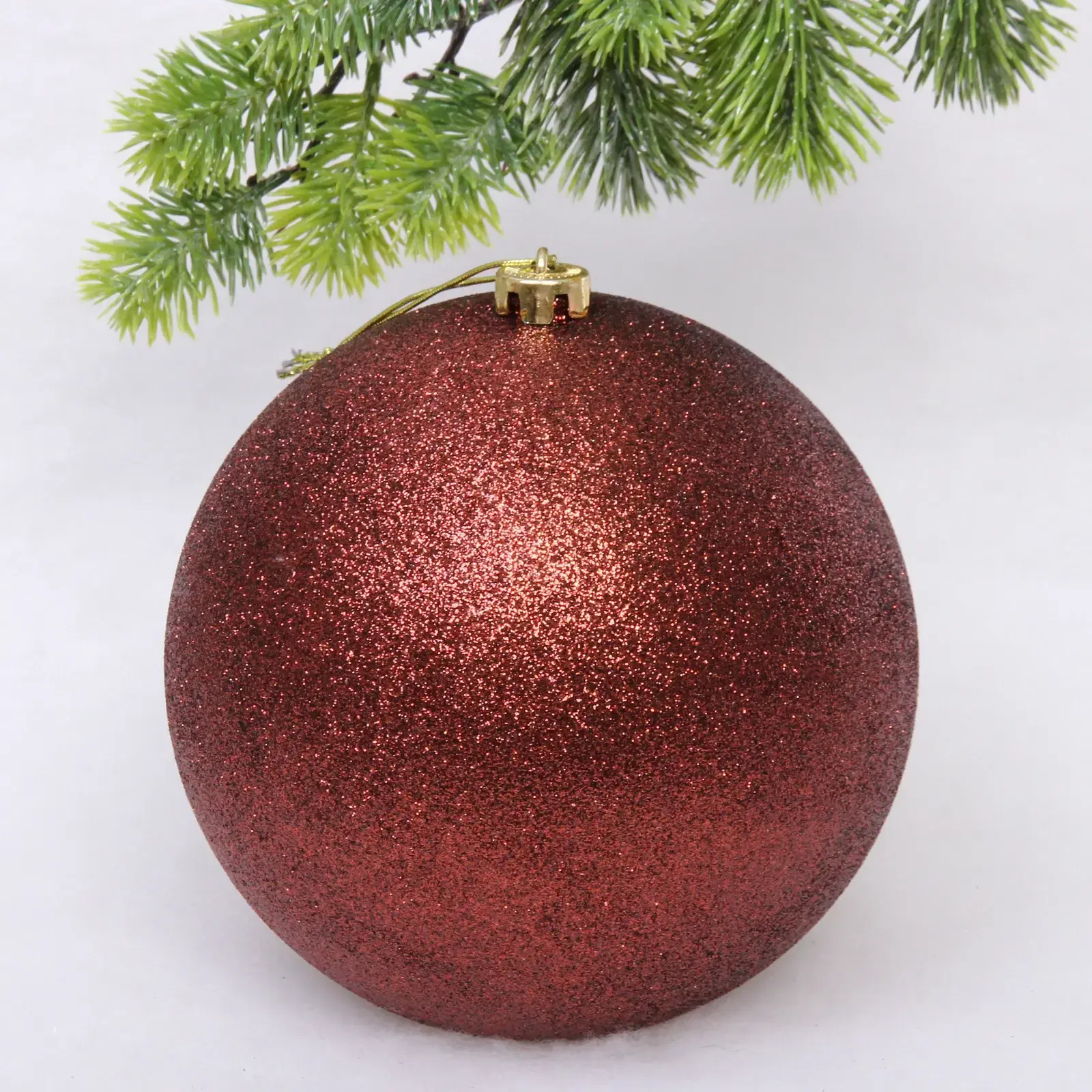 Размер шара составляет 20 см, что делает его заметным элементом декора. Шар выполнен из качественного пластика, что гарантирует его долговечность и легкость. Шоколадный цвет с глиттером добавляет шарму и элегантности, позволяя вам создать уникальный стиль новогоднего оформления.