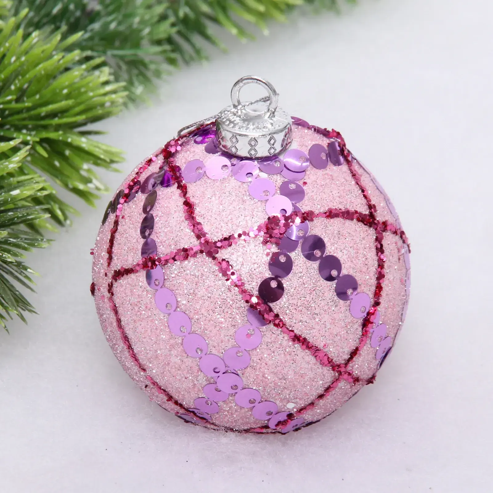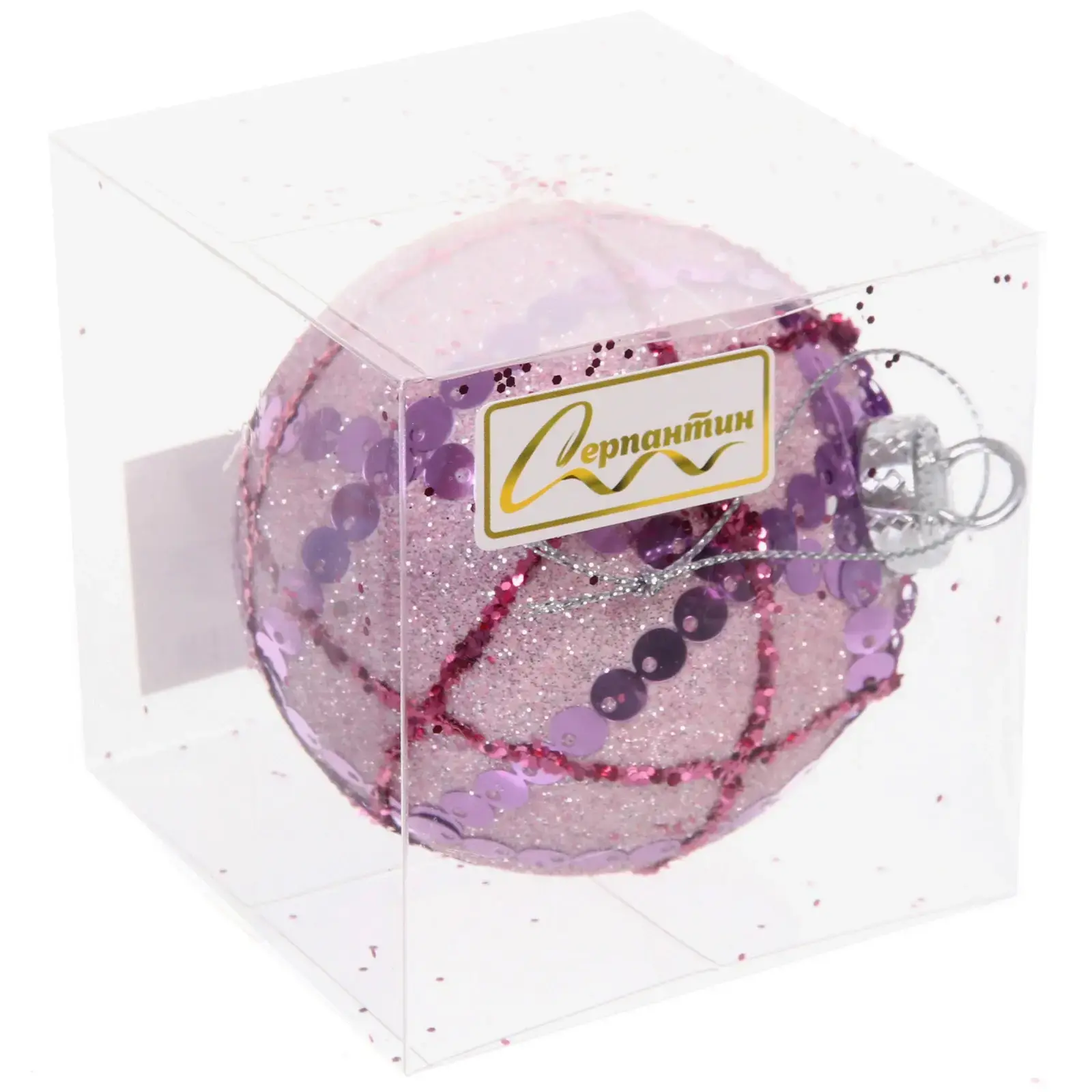 Шар выполнен в нежно-розовом цвете с добавлением фиолетовых и золотистых оттенков, что делает его универсальным для любого стиля оформления. Он упакован в прозрачную коробку, что позволяет сохранить его в идеальном состоянии до следующего праздника. Размер шара составляет 8 см в диаметре, что делает его заметным, но не слишком громоздким элементом декора.
