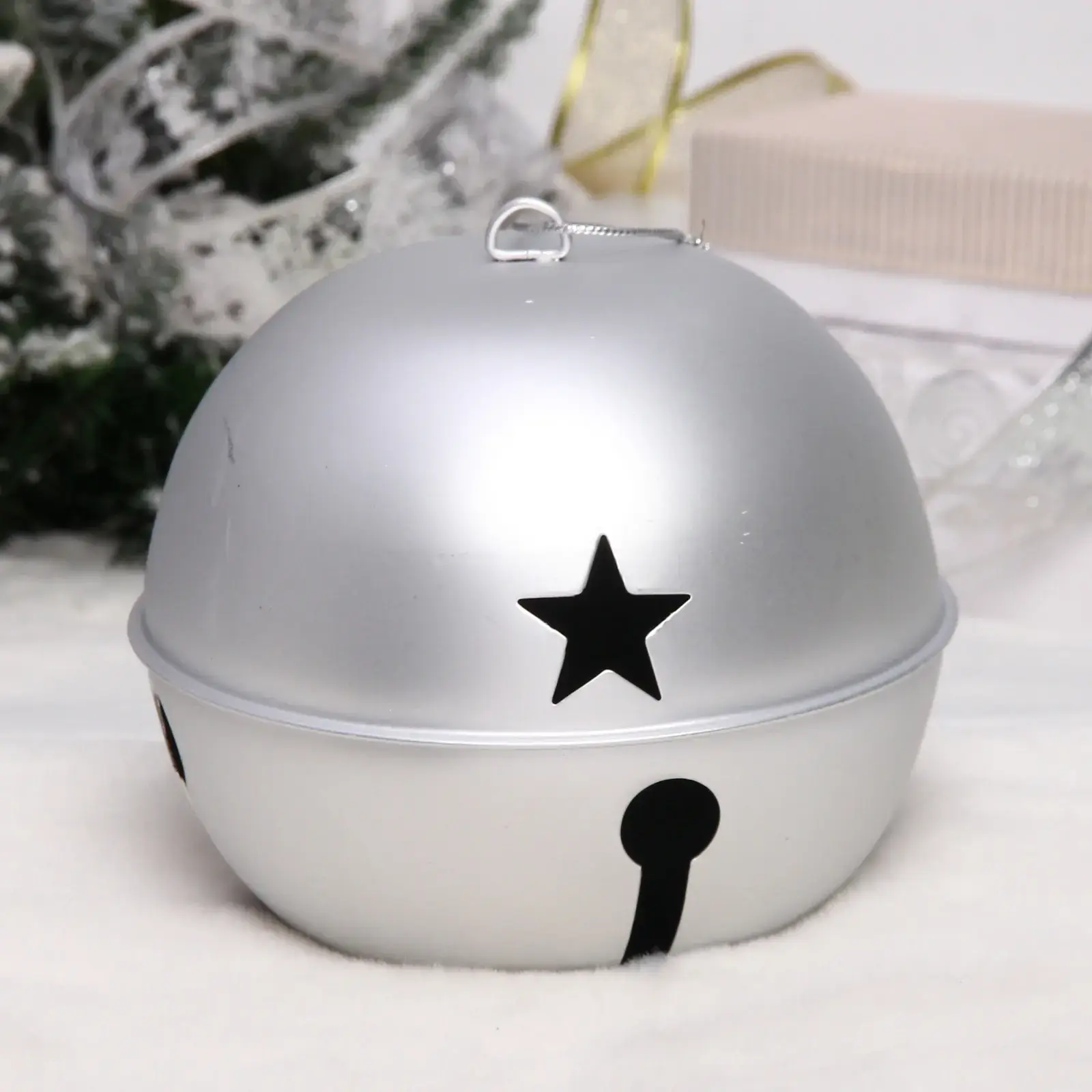 Добавьте изысканный блеск и праздничное настроение в ваш интерьер с этим утонченным серебристым бубенчиком. Его металлическая поверхность с матовым перламутровым отблеском и аккуратные фигурные прорези создают эффект объемного свечения при попадании света. Лёгкий перелив серебра мгновенно ассоциируется с зимней сказкой, а гармоничный дизайн подходит как для классической елочной композиции, так и для современных декоров.