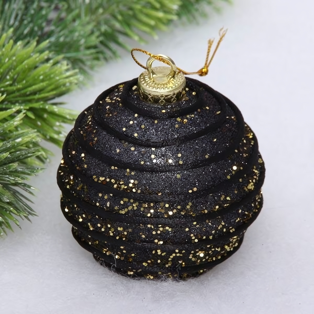 Добавьте праздничного очарования новогоднему дереву с помощью игрушки, которая сразу притягивает взгляд. Чёрный фон, украшенный мерцающими золотыми блёстками, создаёт эффект настоящей роскоши, а рельефная сегментация поверхности добавляет выразительности. Такой шар станет центральным акцентом в любом праздничном оформлении.