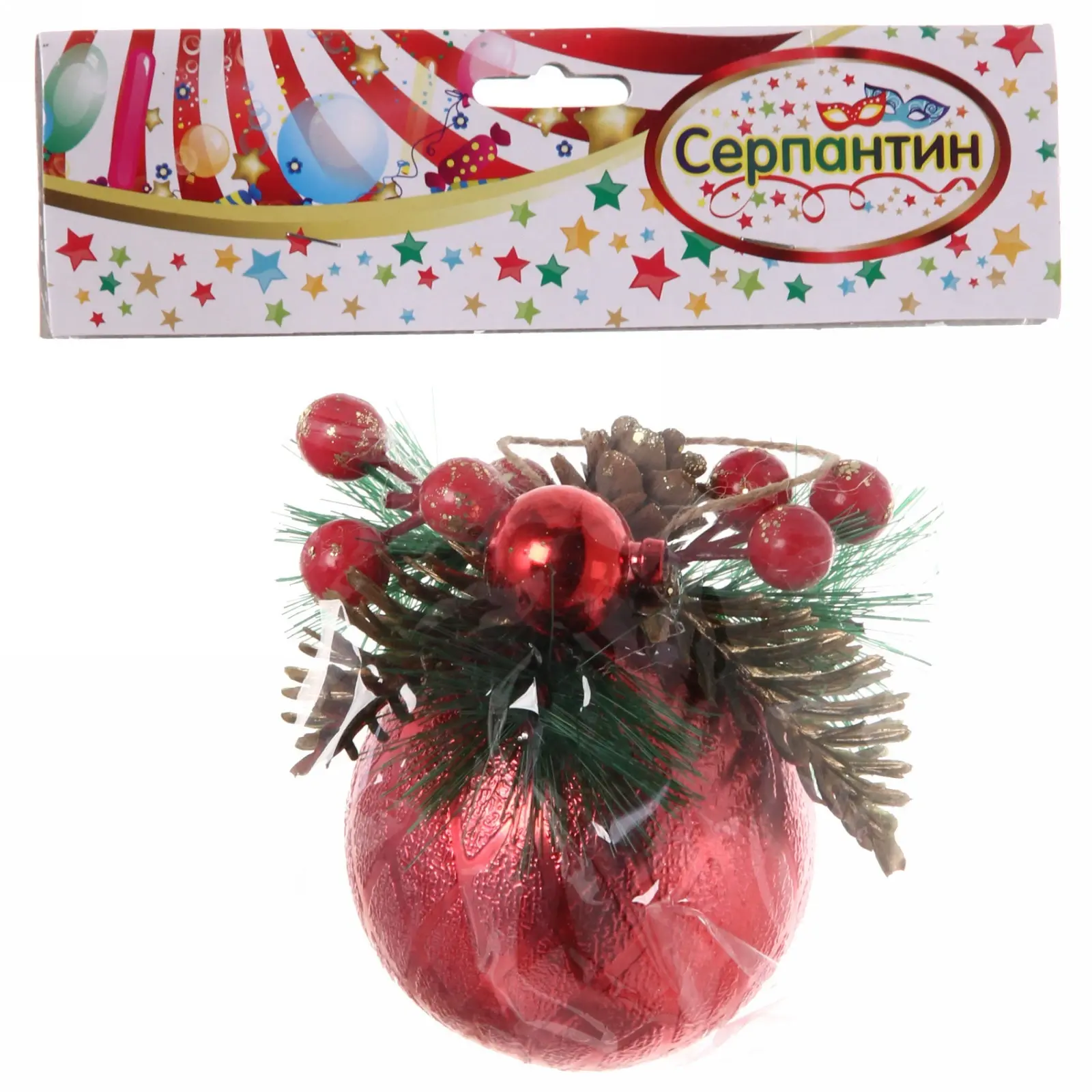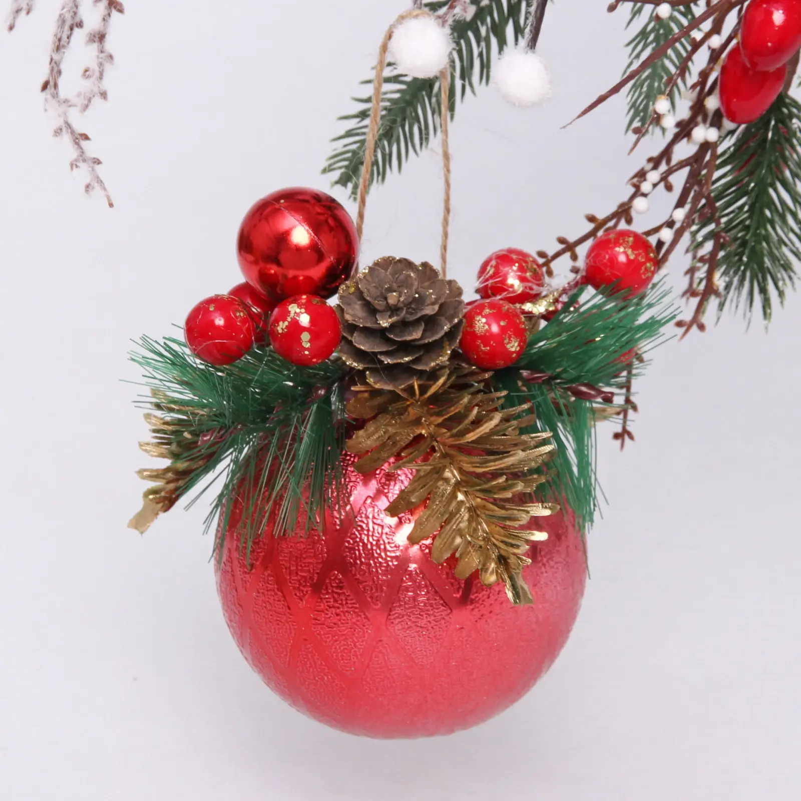 Шар имеет стандартный размер 8 см, что делает его универсальным для различных стилей декора. Материал — пластик, что обеспечивает легкость и устойчивость к повреждениям. Декоративные элементы, такие как шишка и ягоды, добавляют шарму и делают его уникальным.