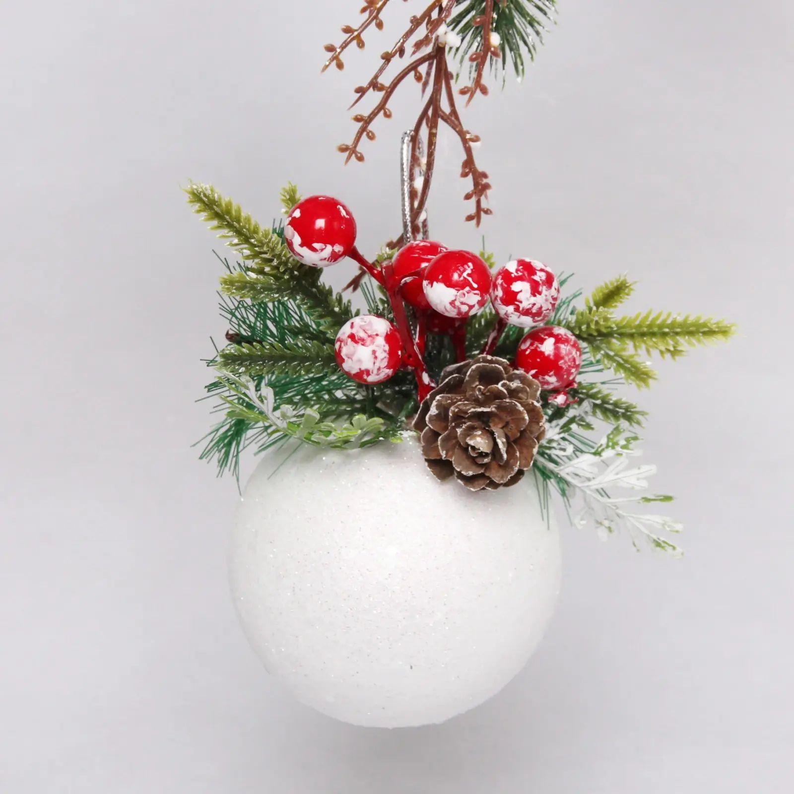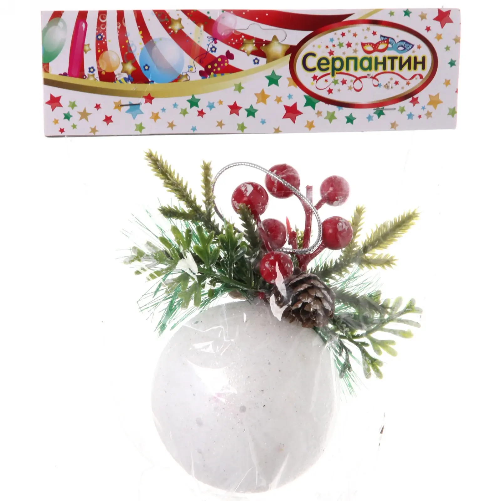 Выбирая этот шар, вы получаете не только красивый элемент декора, но и высокое качество. Декоративные элементы, такие как зеленые веточки, красные ягоды и шишка, выполнены из искусственных материалов, что обеспечивает долговечность и сохранность внешнего вида на протяжении многих сезонов. Гладкая поверхность шара, покрытая блестящей белой пудрой, добавляет ему элегантности и стиля.