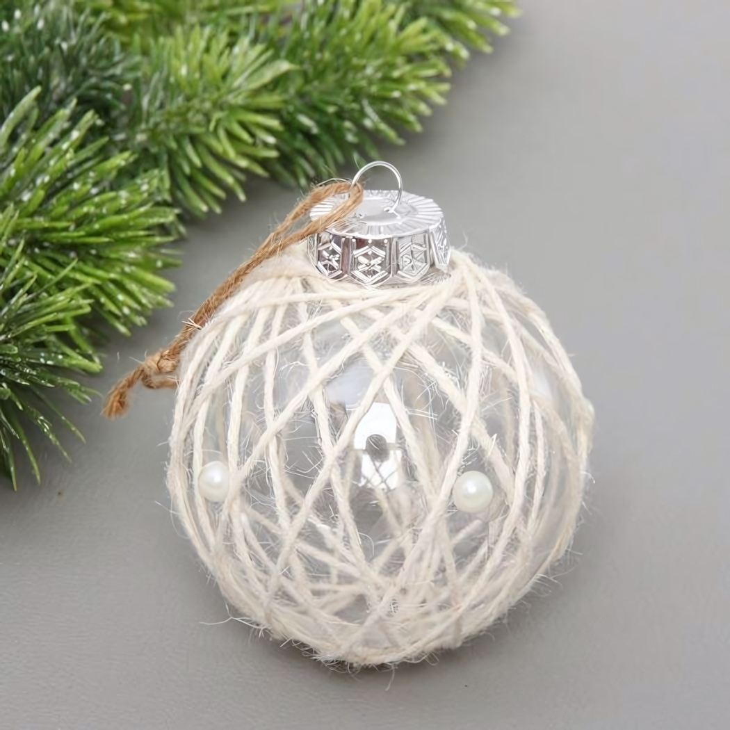 Диаметр шара – 8 см. Поверхность частично прозрачная, с декоративной обмоткой из светлой верёвки и двумя пластиковыми жемчужинами для утончённого вида. Металлический крепёж обеспечивает надёжное подвешивание. Цвет в ассортименте, отгружается один товар, оттенок определяется случайным образом, что добавляет элемент сюрприза при получении.