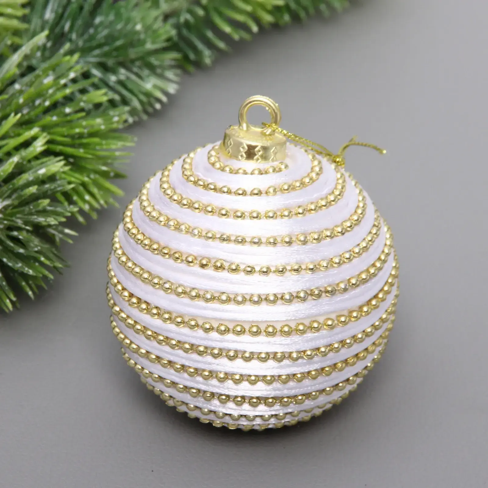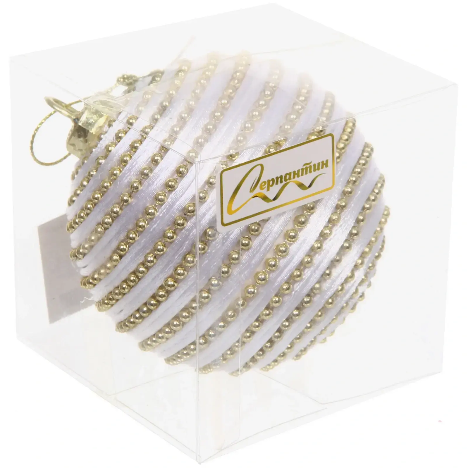 Шар имеет округлую форму и покрыт белой гладкой поверхностью с золотыми полосами, украшенными бусинами. Его размеры (8 см в диаметре) делают его универсальным для любого типа ёлок. Упакован в прозрачную коробку, что позволяет легко хранить его после праздников.