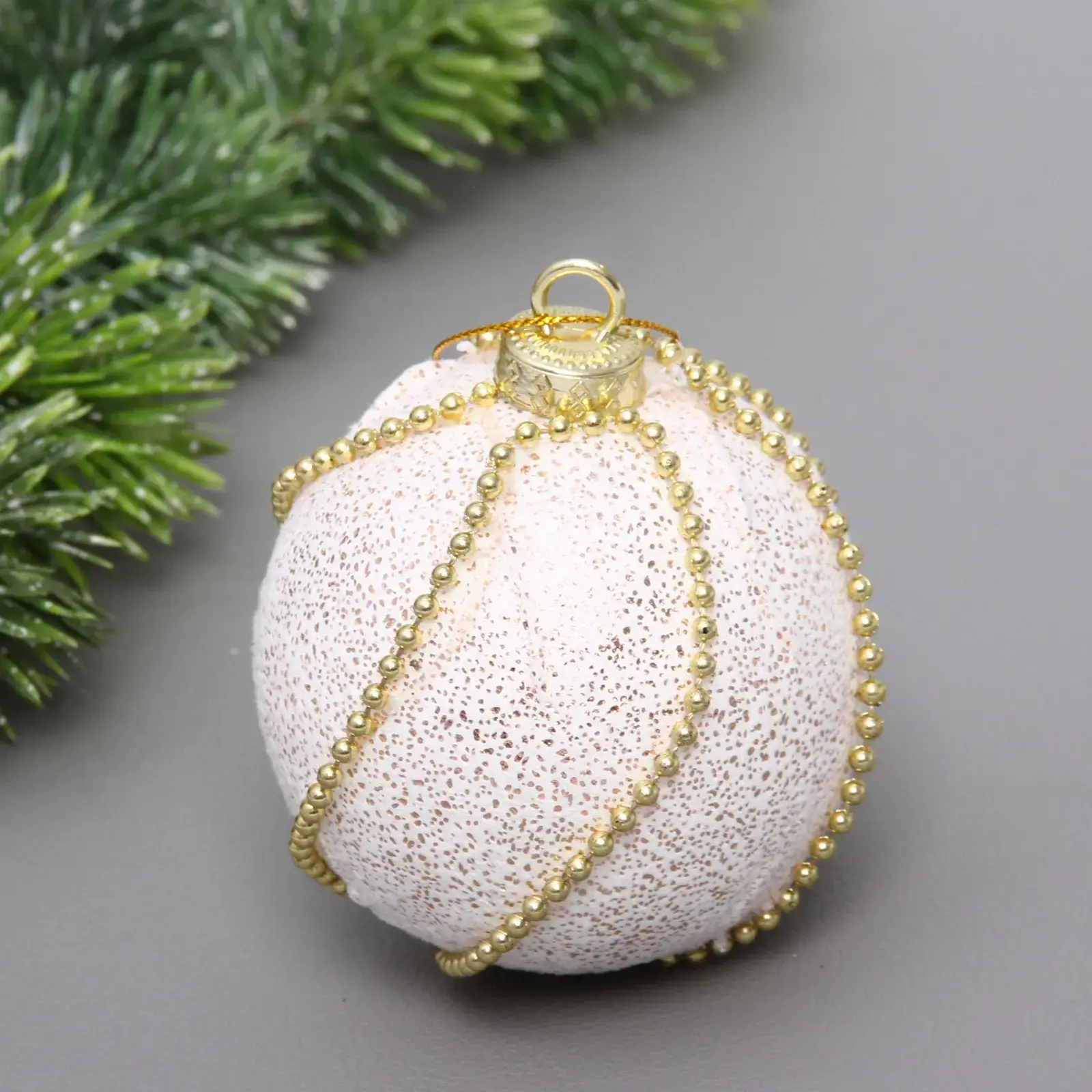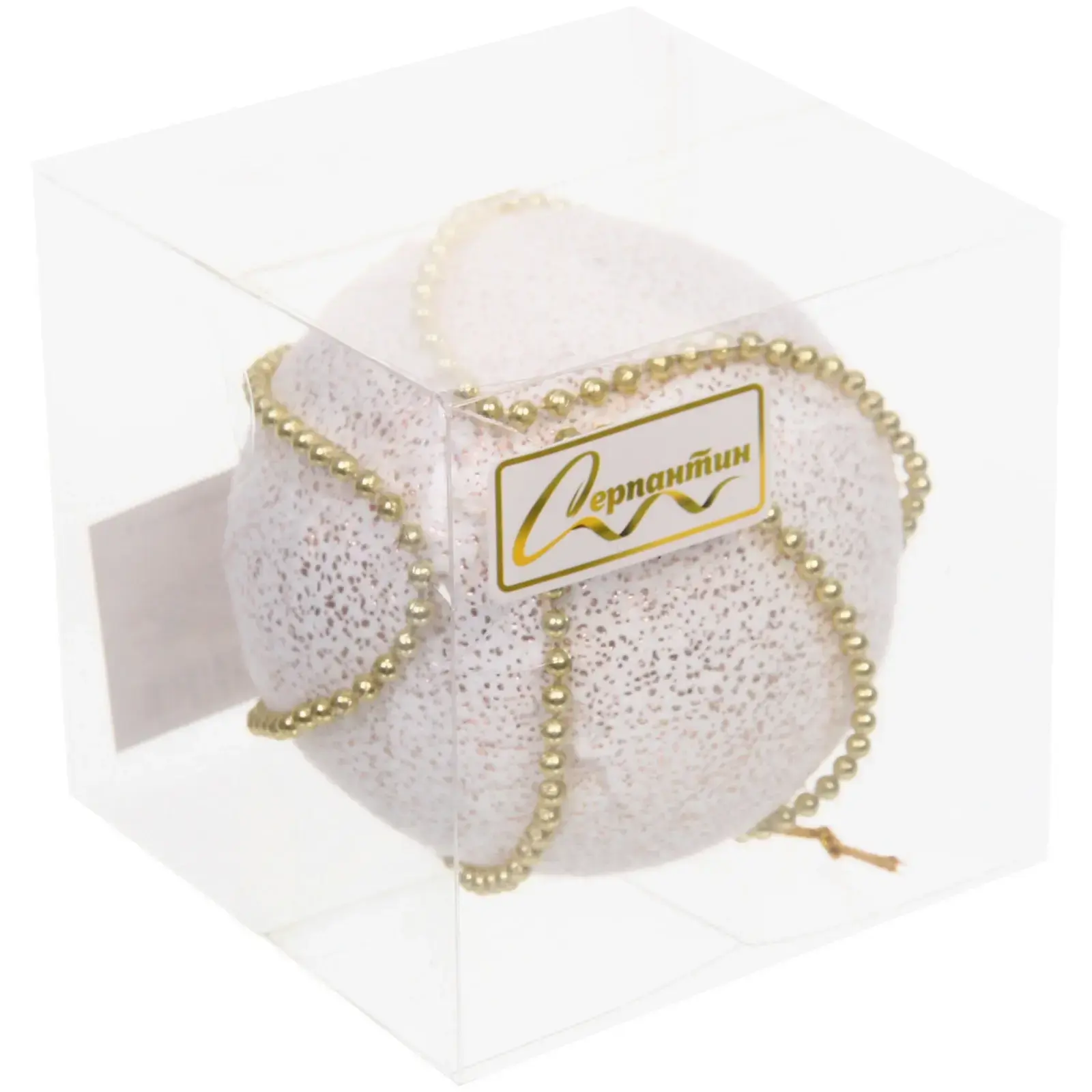 Шар имеет диаметр 8 см и выполнен в белом цвете с золотыми элементами, что делает его универсальным для любого стиля оформления. Его текстурированная поверхность и золотистая цепочка добавляют изысканности и делают его центром внимания. Упаковка шара также продумана: прозрачный контейнер защищает его от повреждений и позволяет видеть красоту изделия со всех сторон.