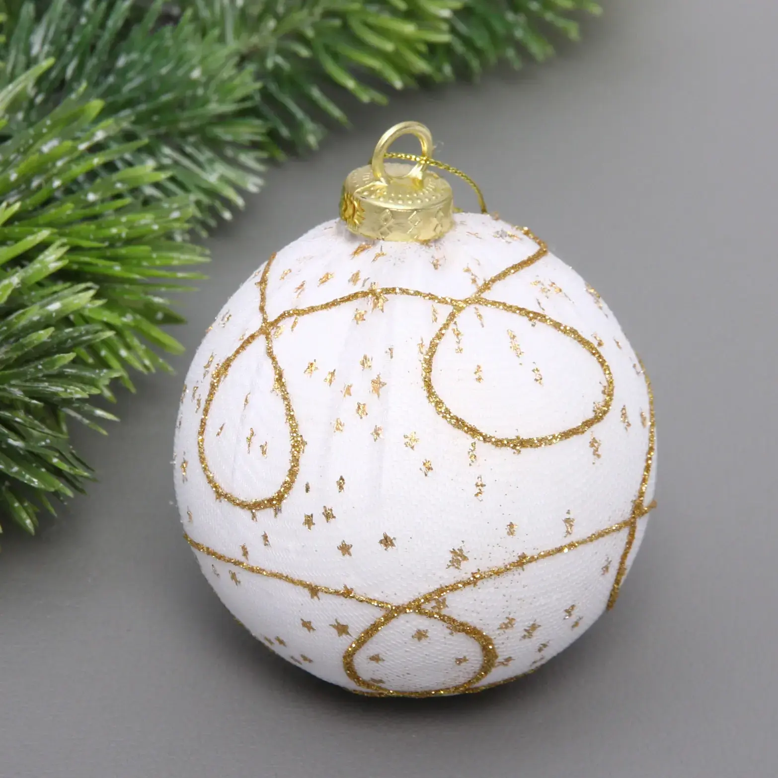 Погрузитесь в атмосферу праздника с новогодним шаром «Зимнее кружево» диаметром 8 см. Этот шар, выполненный в белом цвете с изысканными золотыми узорами, станет идеальным украшением для вашей елки. Его элегантный дизайн и блестящая отделка добавят нотку роскоши в ваш новогодний декор, создавая уютную и праздничную атмосферу.