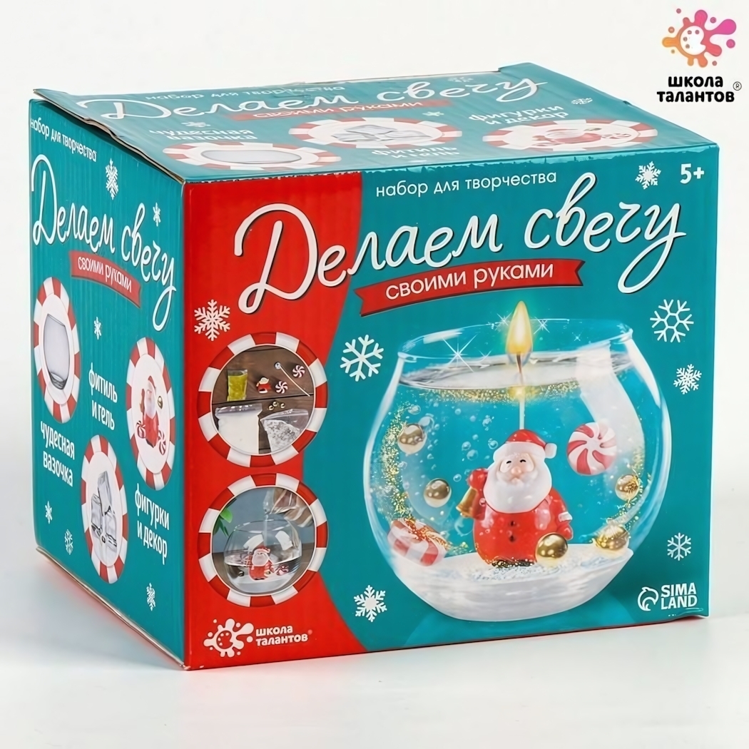 В набор входят: прозрачный гелевый воск 150 мл, стеклянная емкость-форма, фигурка Деда Мороза, набор декоративных элементов (искусственный снег, блестки, миниатюрные конфеты), деревянная палочка для размешивания, подробная инструкция с иллюстрациями.