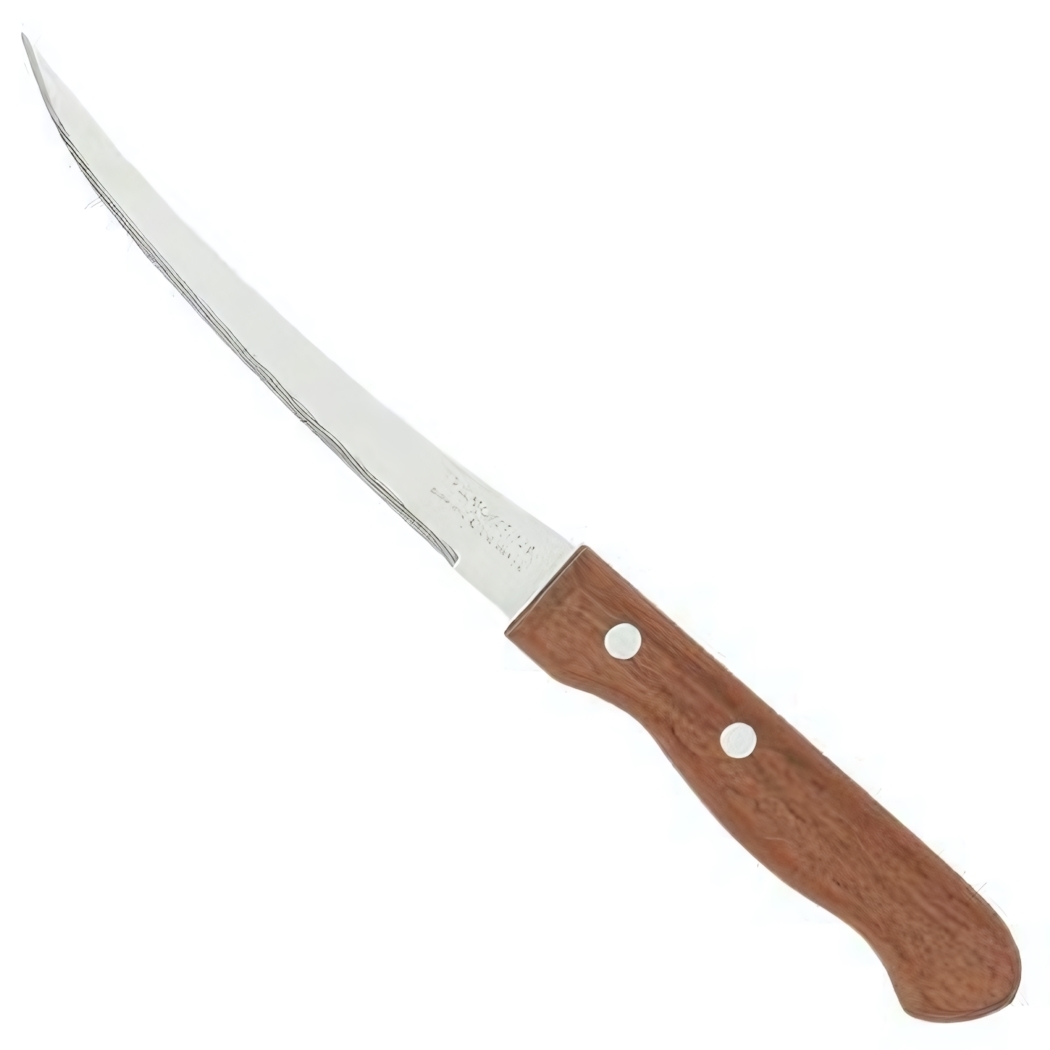 Этот нож предназначен для аккуратной и быстрой нарезки томатов и других мягких овощей. Изогнутое металлическое лезвие обеспечивает чистый и ровный срез, сохраняя форму продукта и предотвращая его сминание. Благодаря длине лезвия 12,5 см он удобен для работы как на домашней кухне, так и в профессиональном кулинарном пространстве.