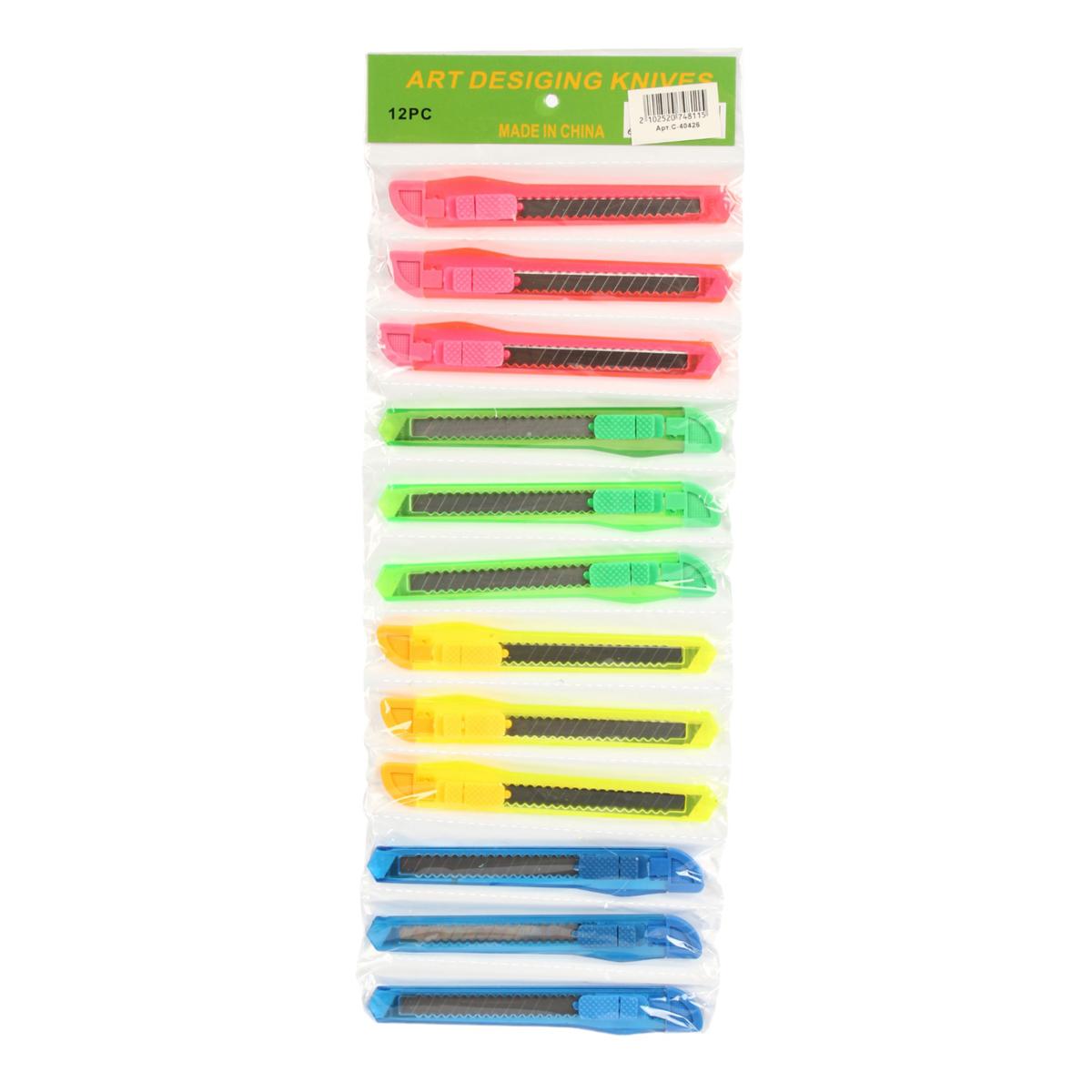 В наборе представлены 12 ножей в четырех ярких неоновых цветах: розовом, синем, желтом и зеленом. Каждый нож имеет длину 9 мм и выполнен из прочного пластика с металлическим лезвием. Упаковка позволяет удобно хранить и извлекать ножи, что делает их использование еще более практичным.