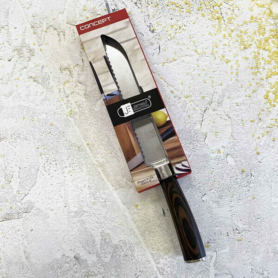 Нож хлебный «CONCEPT» с зубчатым лезвием обеспечивает аккуратные ломтики без крошек, сохраняя структуру даже самого воздушного багета. Эргономичная рукоятка из дерева и прочная нержавеющая сталь делают его незаменимым помощником на каждой кухне.
