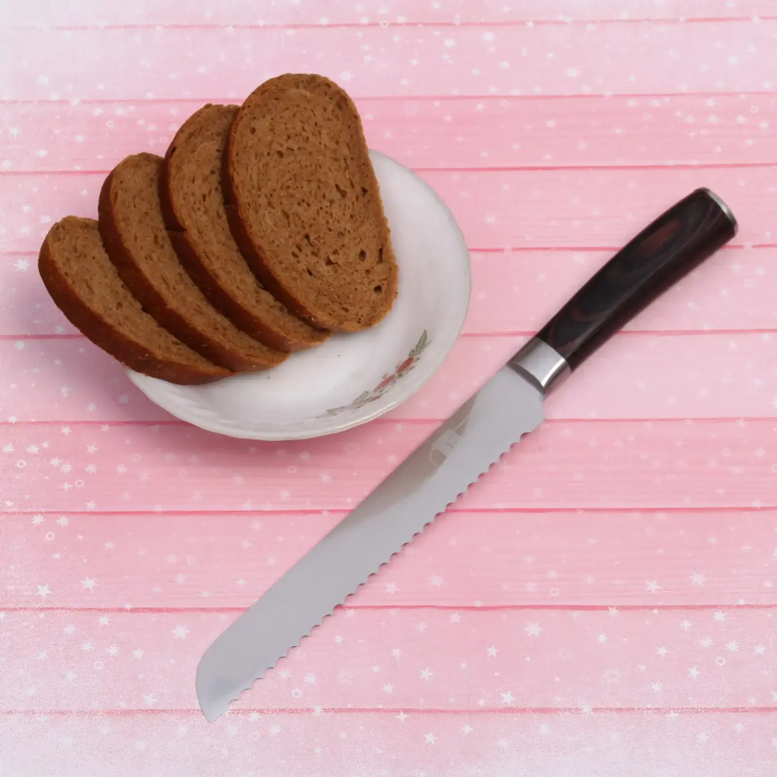 - Зубчатое лезвие 20 см легко справляется с хрустящими корочками и мягкой мякотью
