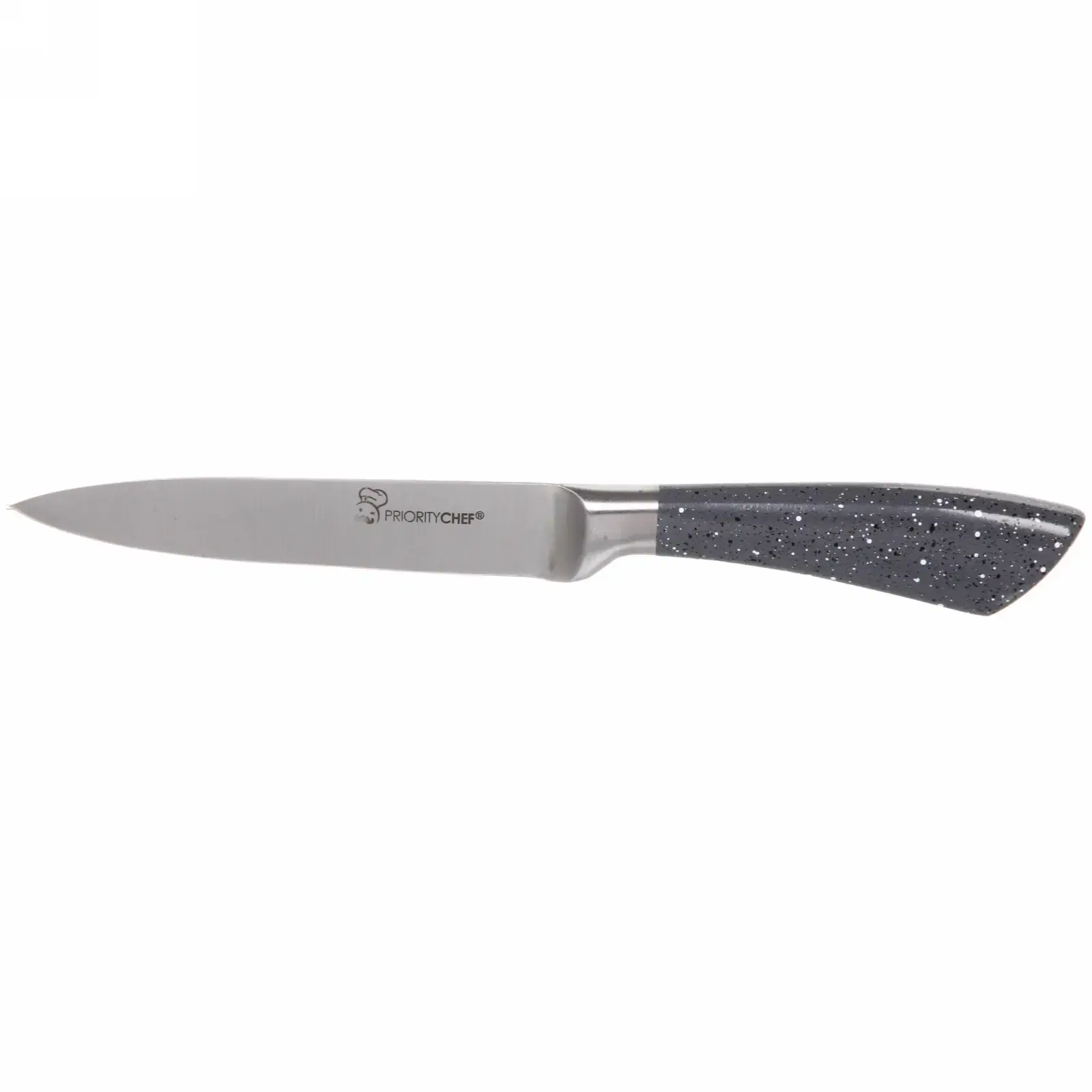 Нож предназначен для универсального использования, подходит как для профессиональных поваров, так и для домашних кулинаров. Его длина лезвия составляет 5 дюймов (примерно 12,7 см), что делает его идеальным для нарезки различных продуктов. Эргономичная рукоятка обеспечивает надежный и комфортный хват, что позволяет работать с ножом долгое время без усталости.
