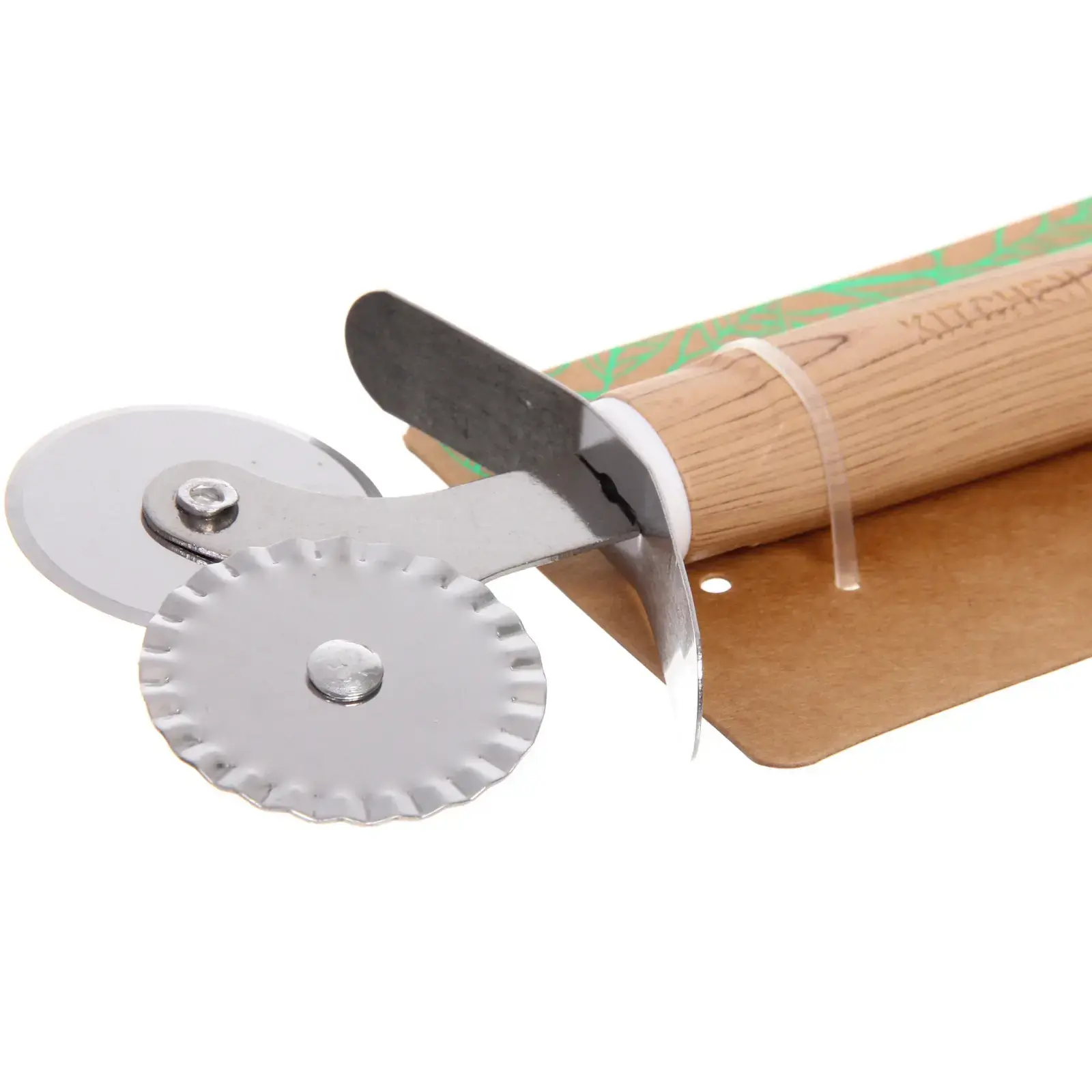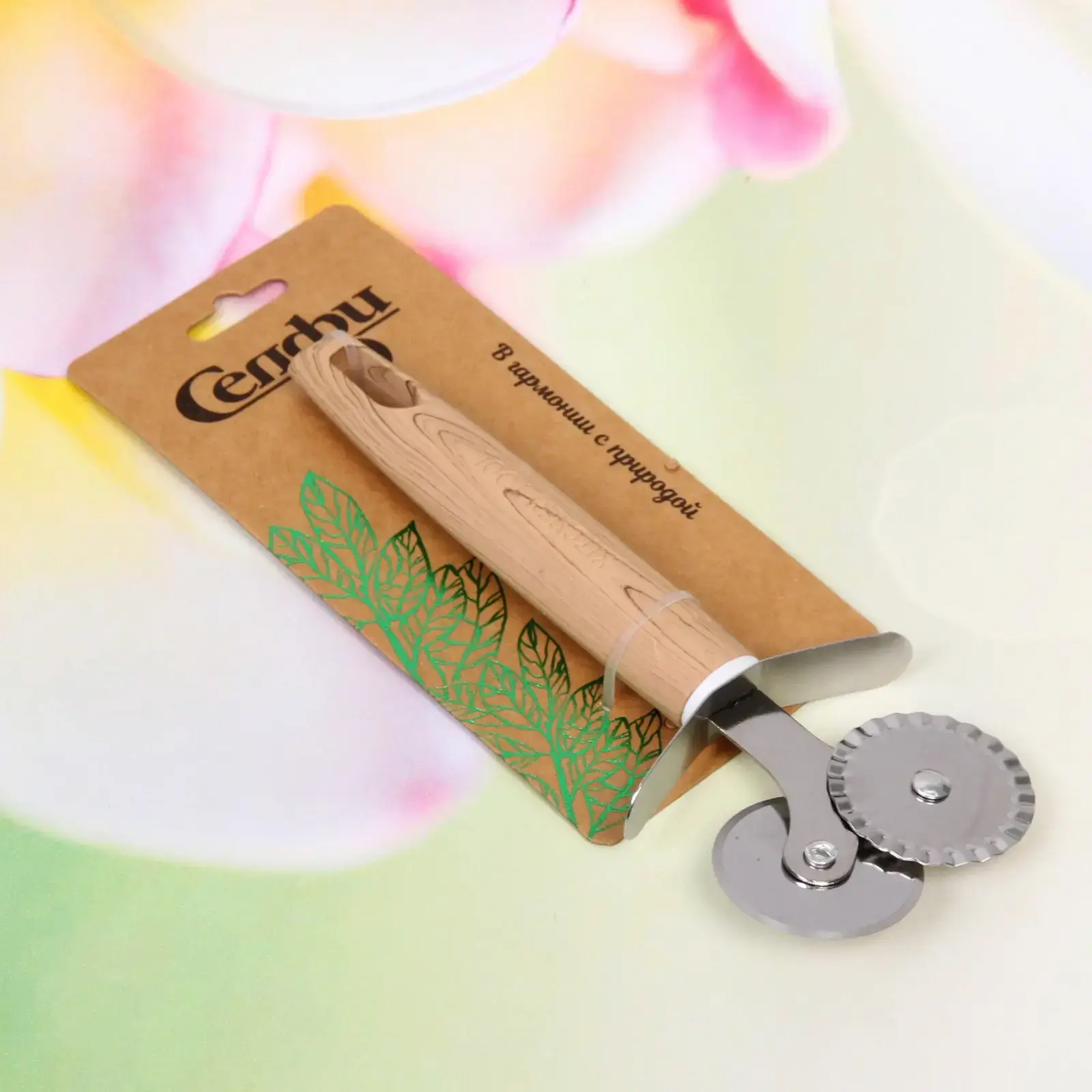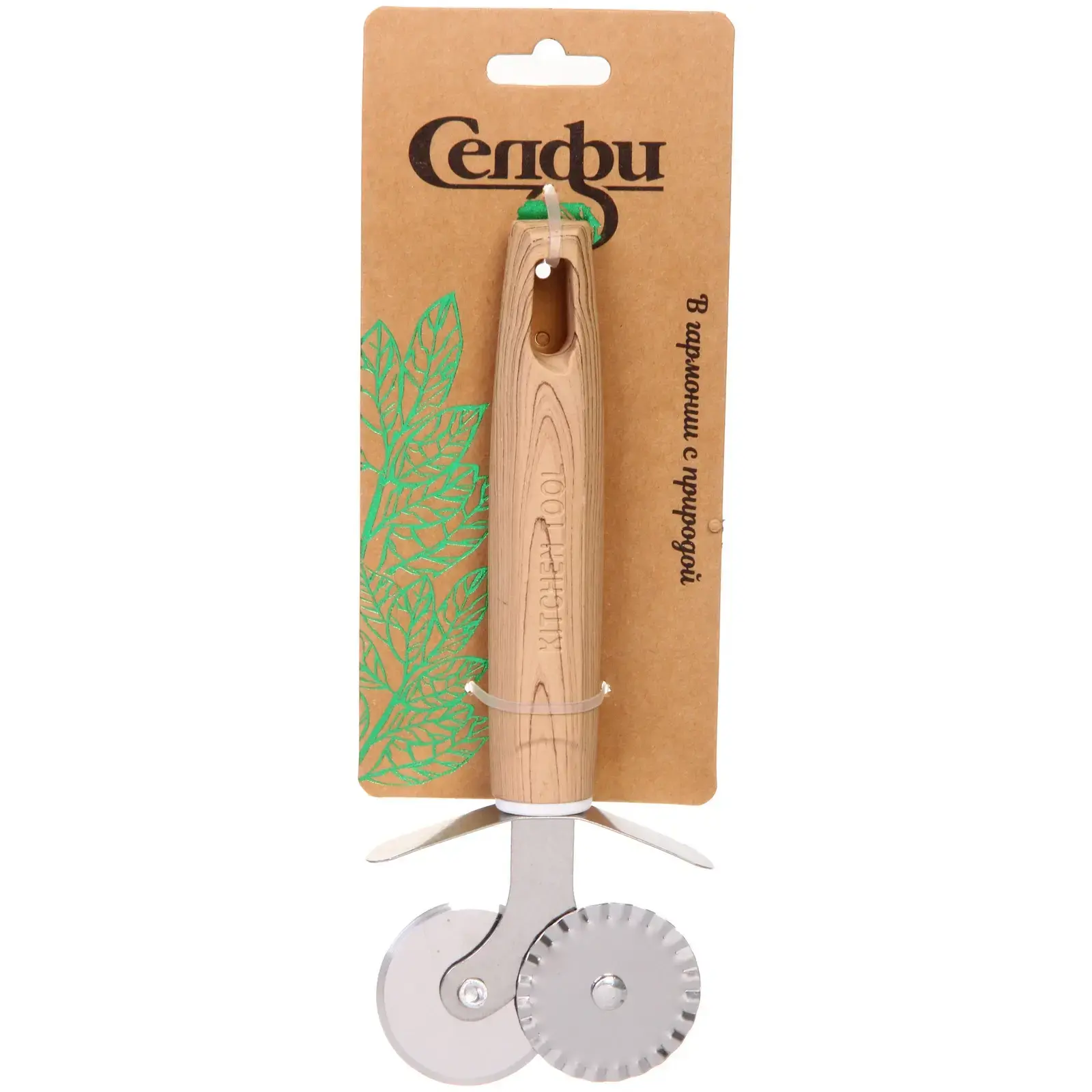Нож имеет длину 25 см, что делает его удобным для работы с различными размерами пиццы. Ручка выполнена из пластика с принтом под дерево, а лезвия — из нержавеющей стали, что обеспечивает надежность и долговечность. Упаковка ножа оформлена в экологичном стиле с изображением зелёных листьев, подчеркивающим его натуральность и гармонию с природой.