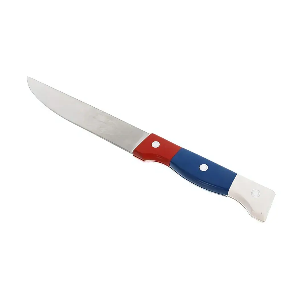 Длина лезвия составляет 15 см, что делает его идеальным для различных кулинарных задач. Ручка ножа состоит из трех цветных сегментов: красного, синего и белого, что придает ему уникальный и привлекательный вид. Нож также оснащен двумя пластиковыми крепежными элементами, которые обеспечивают надежное соединение лезвия и ручки.