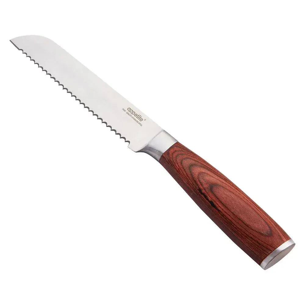 Серрейторное лезвие из нержавеющей стали гарантирует аккуратную нарезку даже самой хрустящей корочки, сохраняя форму и текстуру продукта. Эргономичная деревянная ручка с металлическим ободком обеспечивает надежный захват и комфорт при ежедневном использовании.