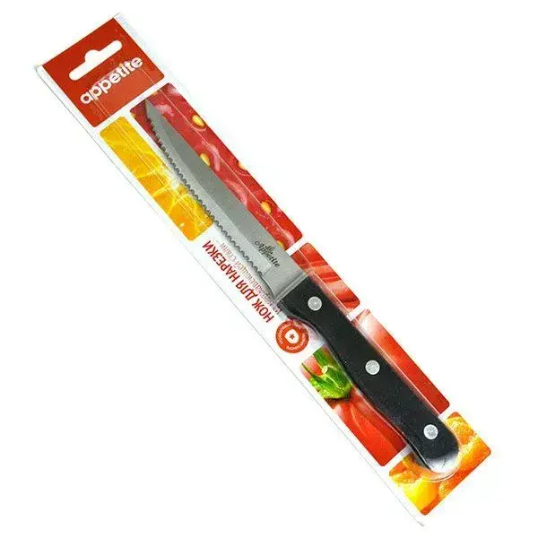 Нож для хлеба и овощей Appetite, зубчатый, нерж. сталь 11см, черная ручка с заклепками, блистер