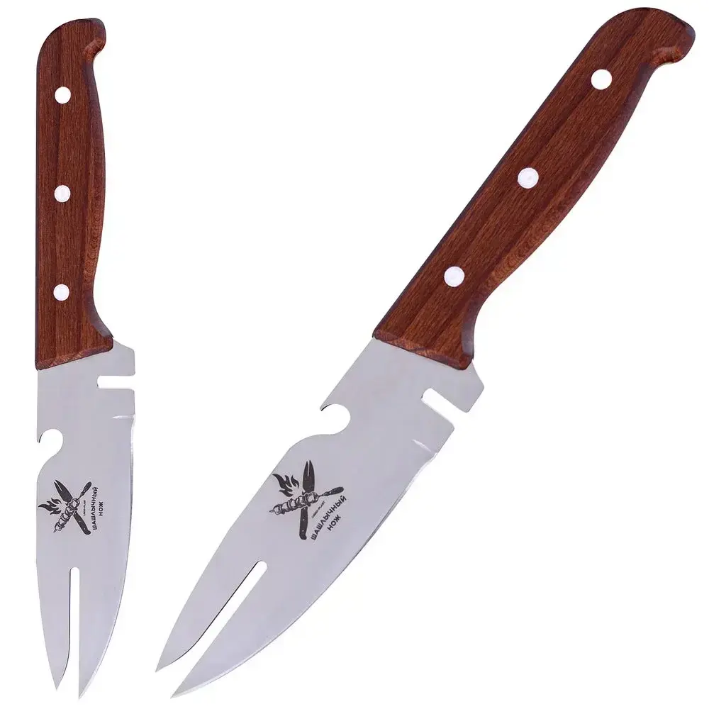 Этот нож идеально подходит для любителей шашлыков и активного отдыха. Он не только нарезает, но и очищает шампуры от нагара благодаря боковой прорези. Кроме того, встроенная открывалка позволяет без труда откупорить бутылки с вашими любимыми напитками, что делает его многофункциональным инструментом для любого мероприятия на свежем воздухе.
