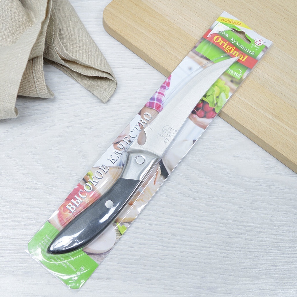 Длина лезвия составляет 13,5 см, а общая длина ножа — 24,5 см, что делает его идеальным для различных задач на кухне. Нож упакован в яркую пластиковую упаковку, оформленную изображениями овощей и фруктов, что подчеркивает его предназначение. Выбирая этот нож, вы получаете не только качественный инструмент, но и стильный элемент для вашей кухни.