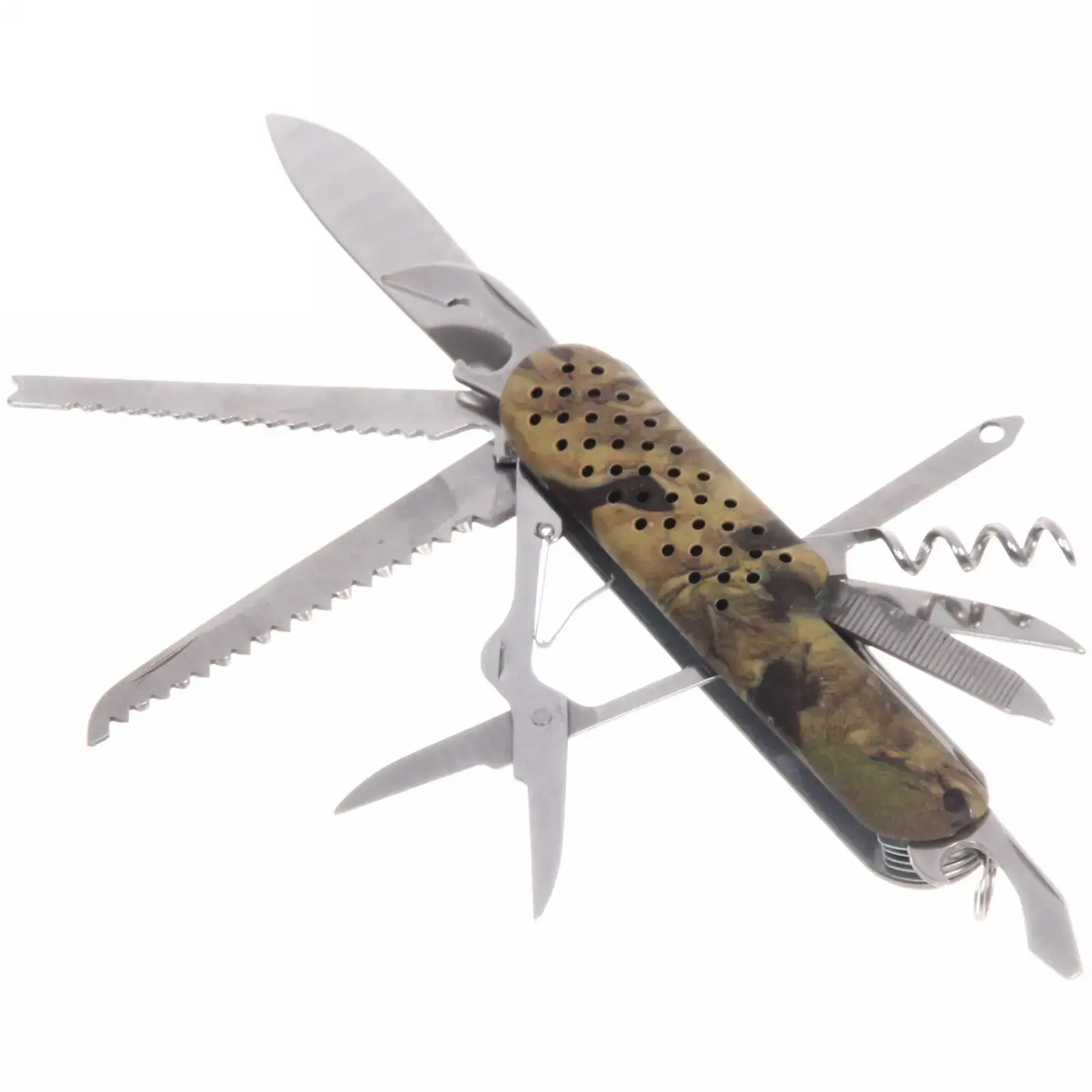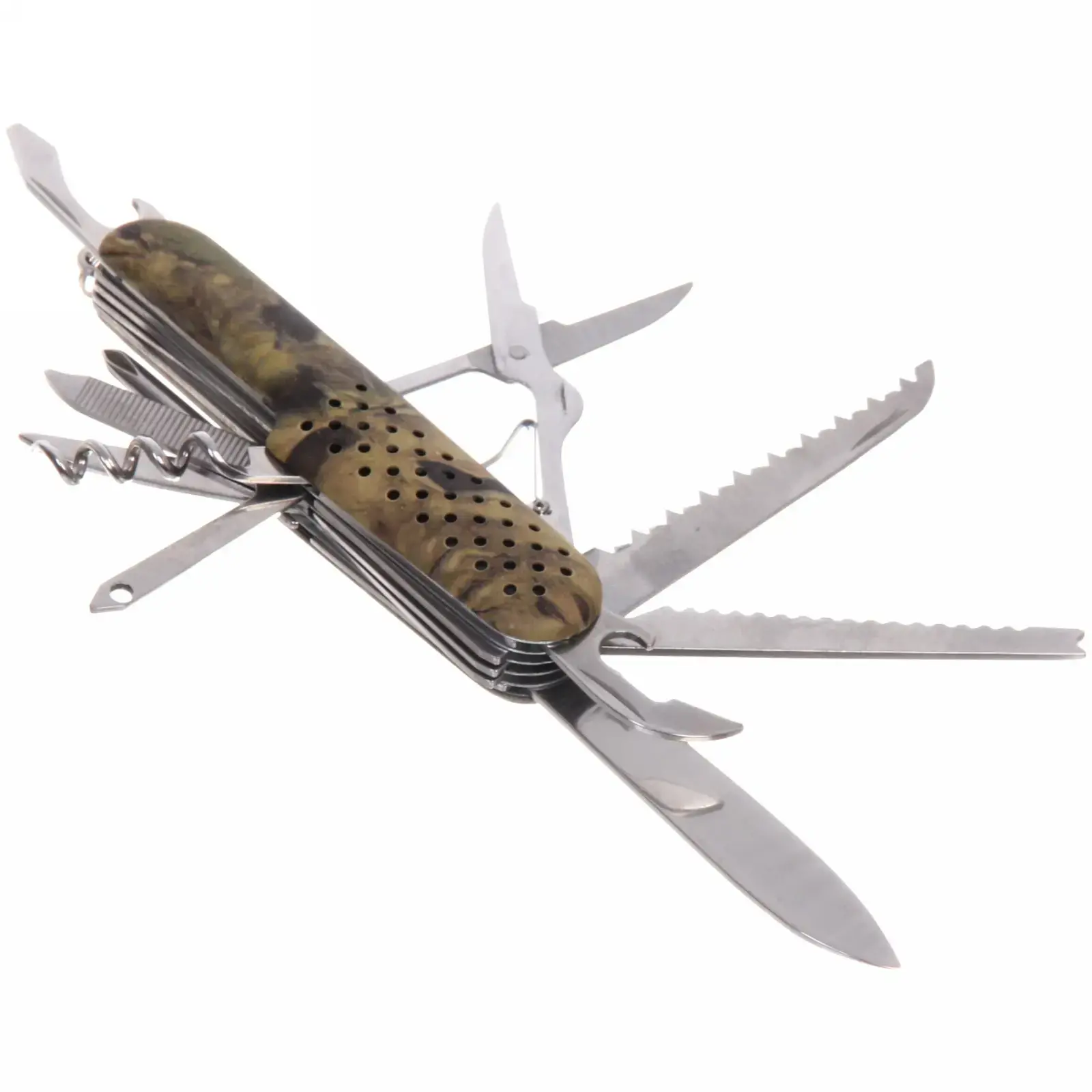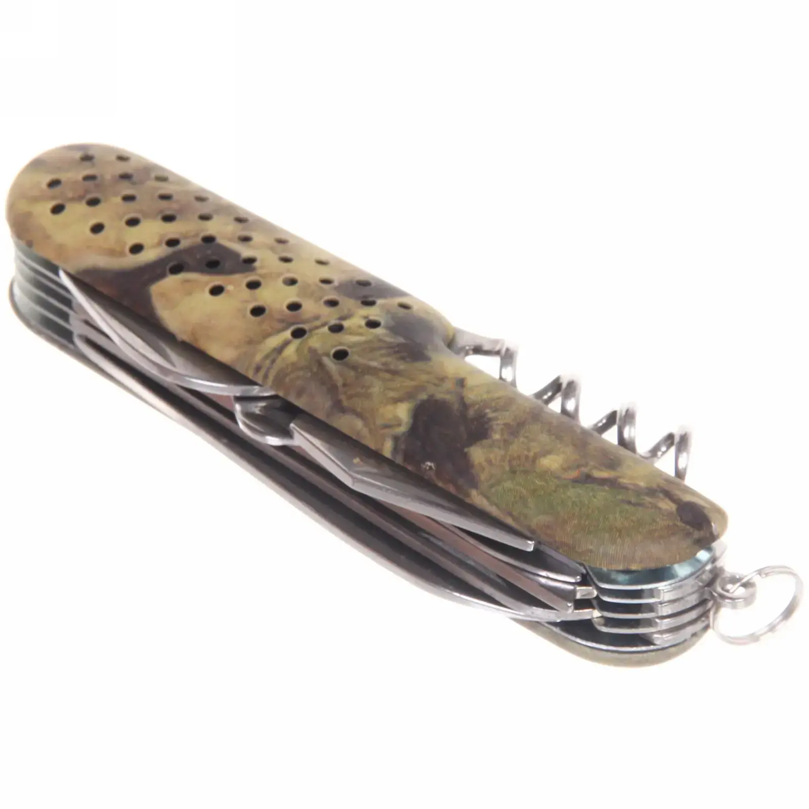 Выбирая этот многофункциональный нож, вы получаете не только качественный инструмент, но и практичное решение для любых ситуаций. Камуфляжный дизайн ручки не только придает ножу стильный вид, но и обеспечивает надежный захват. Нержавеющая сталь гарантирует, что нож будет служить вам долго, не теряя своих качеств.