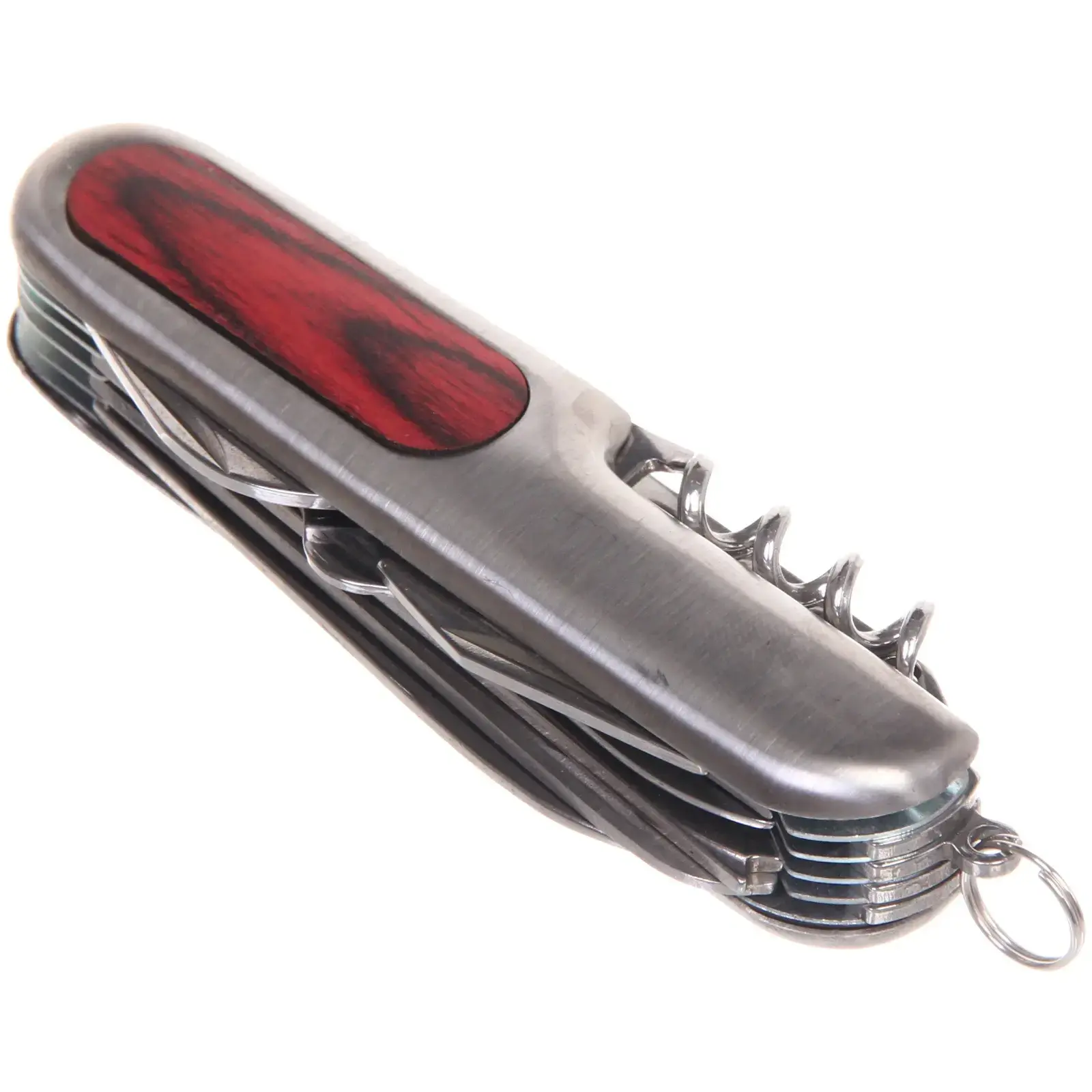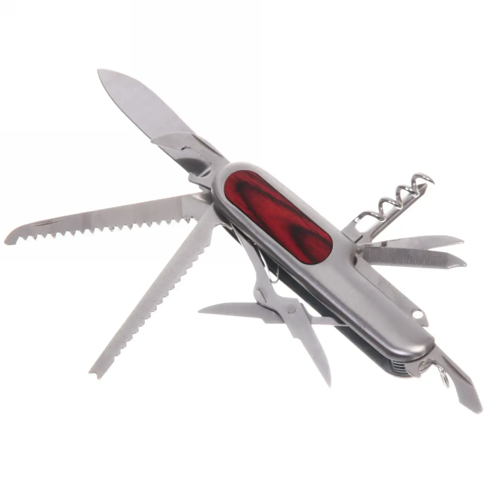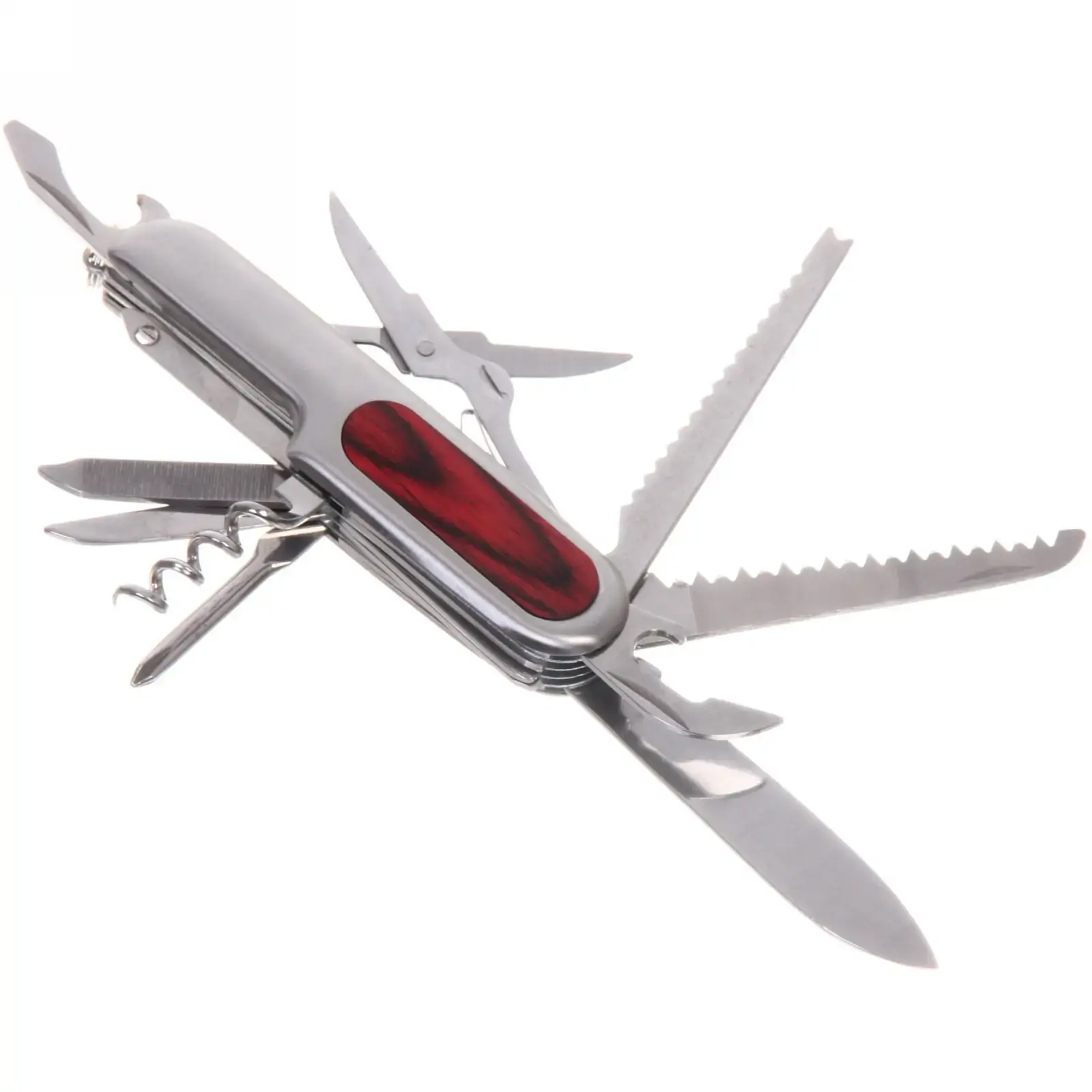 Нож включает в себя основные инструменты, такие как: основное лезвие, пила, ножницы, открывалка для бутылок, штопор, напильник, шило и отвертка. Все инструменты выполнены из прочной нержавеющей стали, что гарантирует их долговечность и надежность. Этот нож идеально подходит для туристов, рыболовов, дачников и всех, кто ценит удобство и многофункциональность.