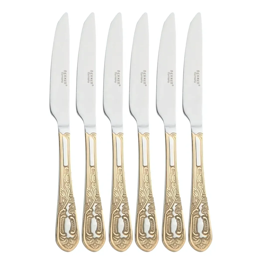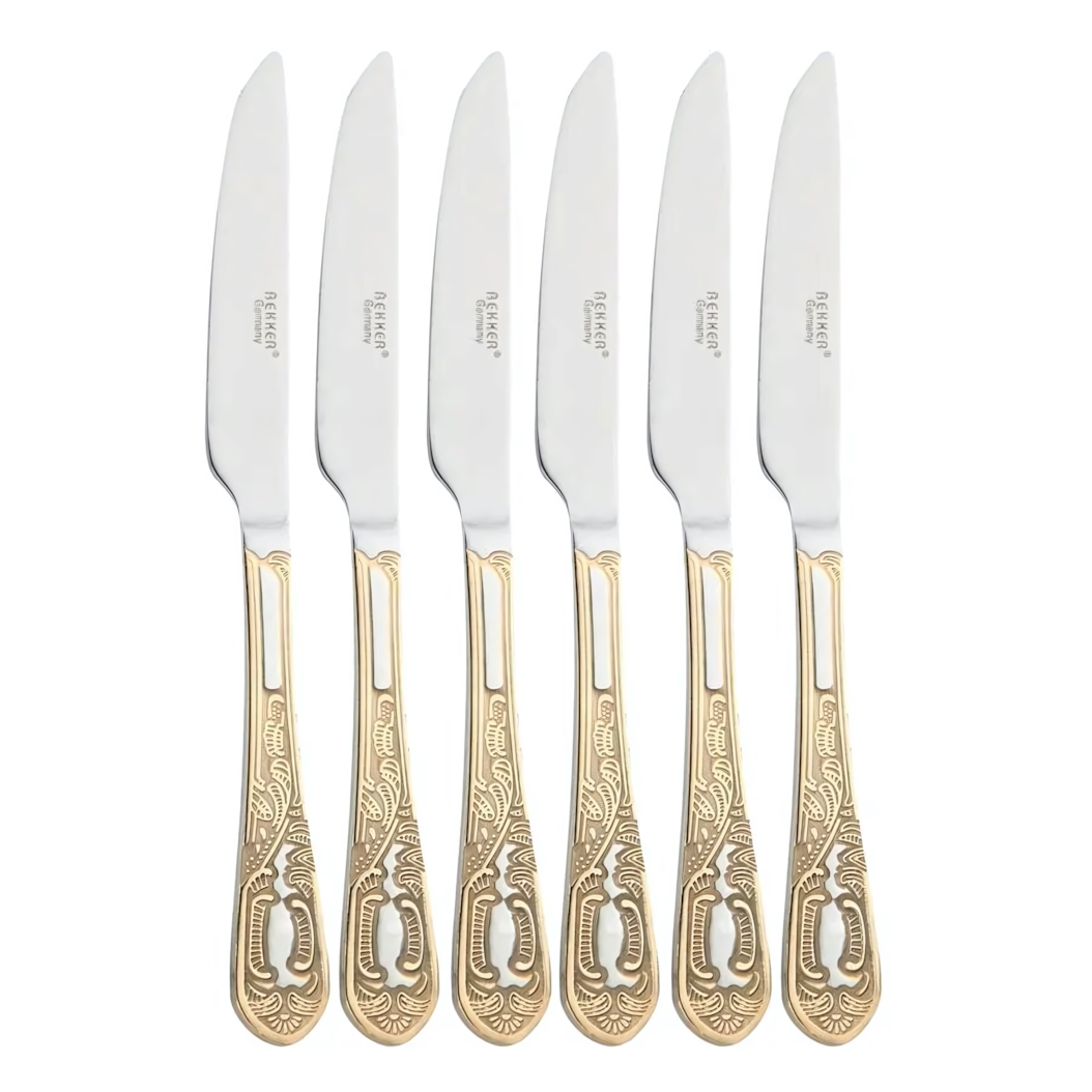 Дизайн ножей выполнен в классическом стиле. Золотистый акцент на рукоятке с детализированным орнаментом придаёт приборам нарядный вид, делая их уместными как для повседневной трапезы, так и для праздничного стола. Все шесть ножей в наборе идентичны, что обеспечивает эстетическую гармонию при сервировке.