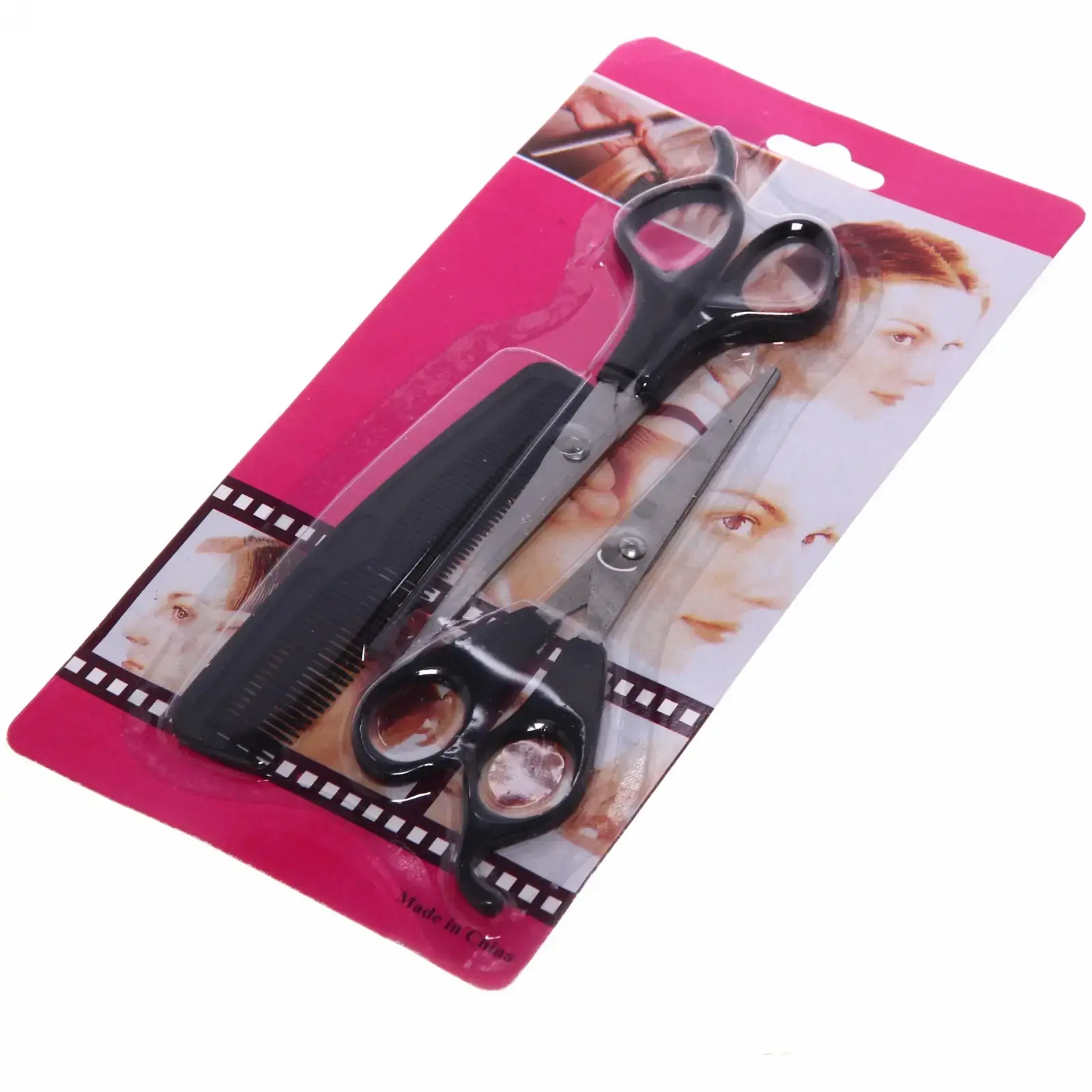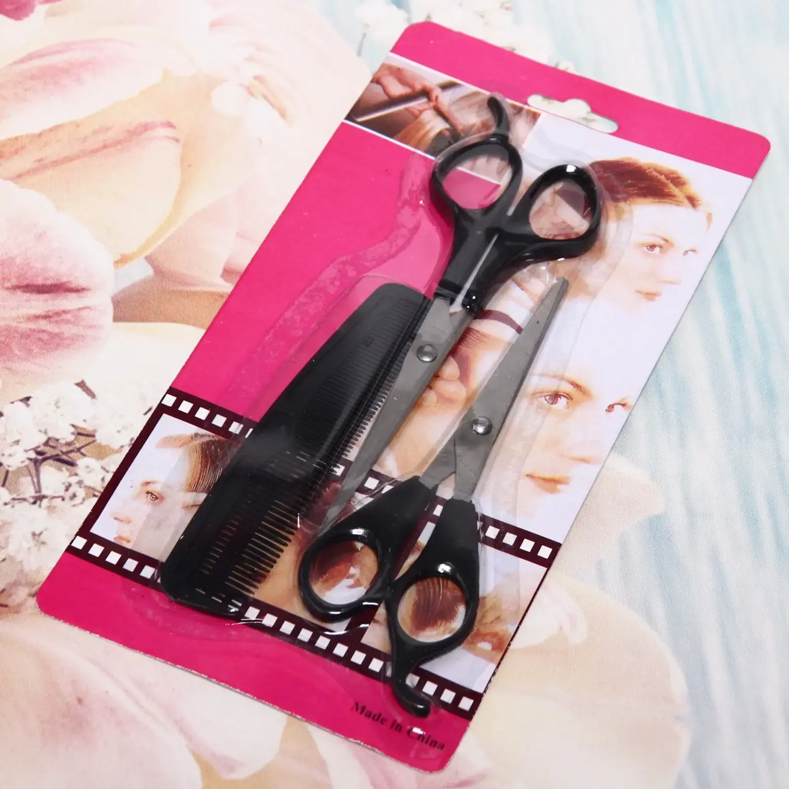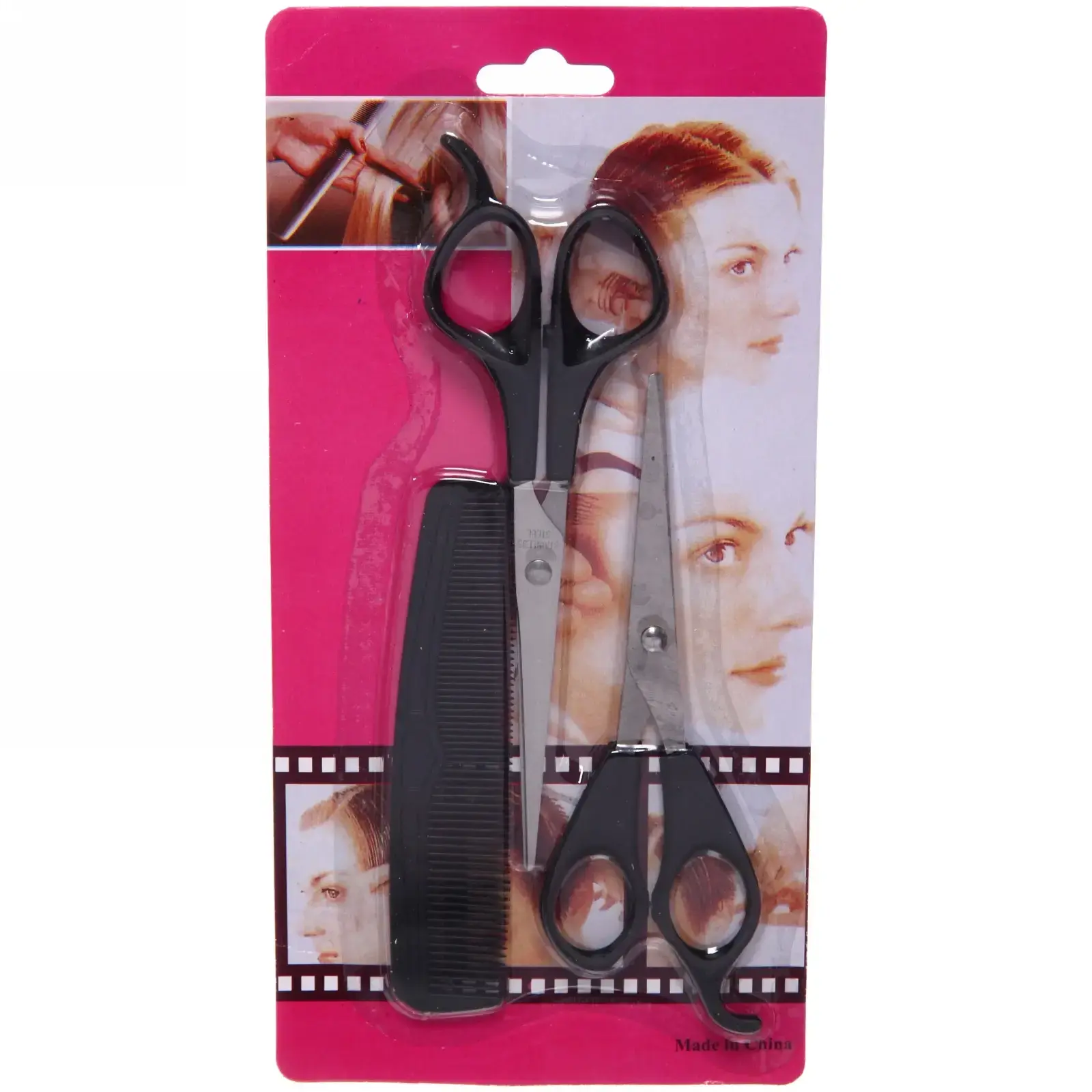 Размер ножниц составляет 16,5 см, что является стандартным для парикмахерских инструментов. Ножницы имеют черные пластиковые ручки, а расческа также выполнена в черном цвете. Упаковка оформлена в ярких розовых тонах, что делает набор привлекательным и стильным. Этот комплект станет отличным подарком для любителей ухода за волосами и профессиональных парикмахеров.