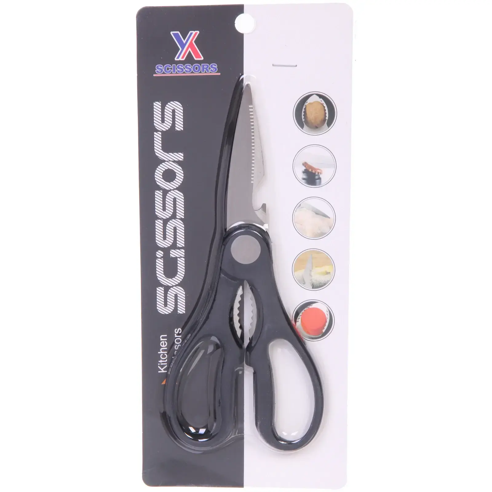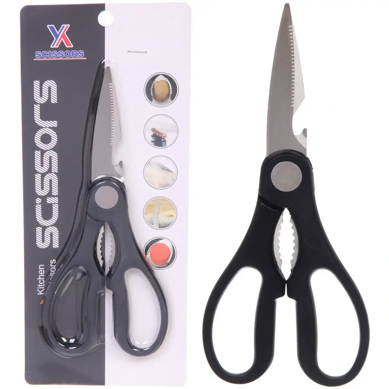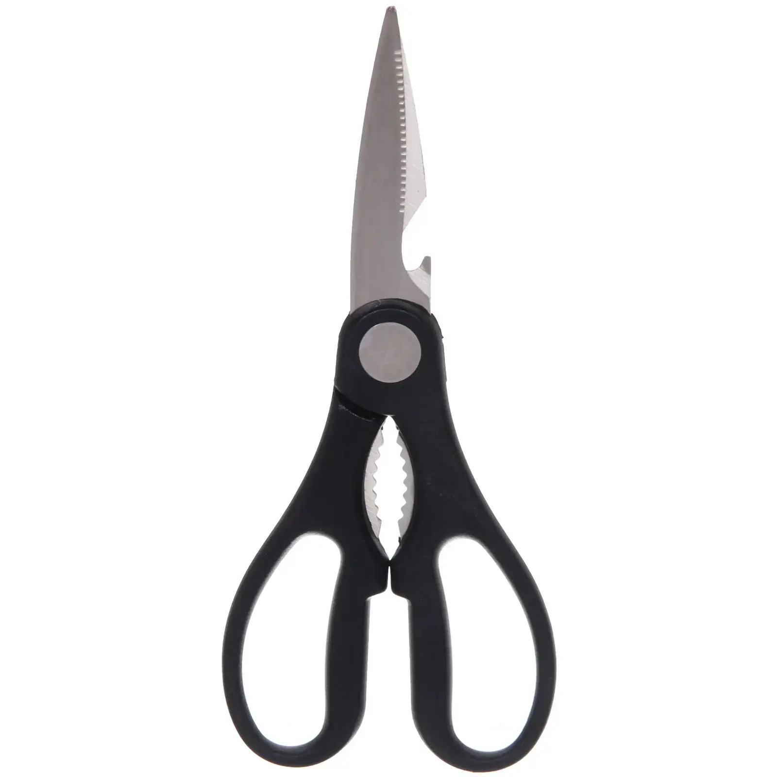 Кухонные ножницы имеют удобные черные пластиковые ручки, которые обеспечивают надежный хват. Металлические лезвия с зубчатой кромкой позволяют легко резать даже самые твердые продукты. Кроме того, встроенный орехокол и открывашка делают их еще более универсальными. Эти ножницы идеально подходят для использования в домашних условиях, а также в кафе и ресторанах.