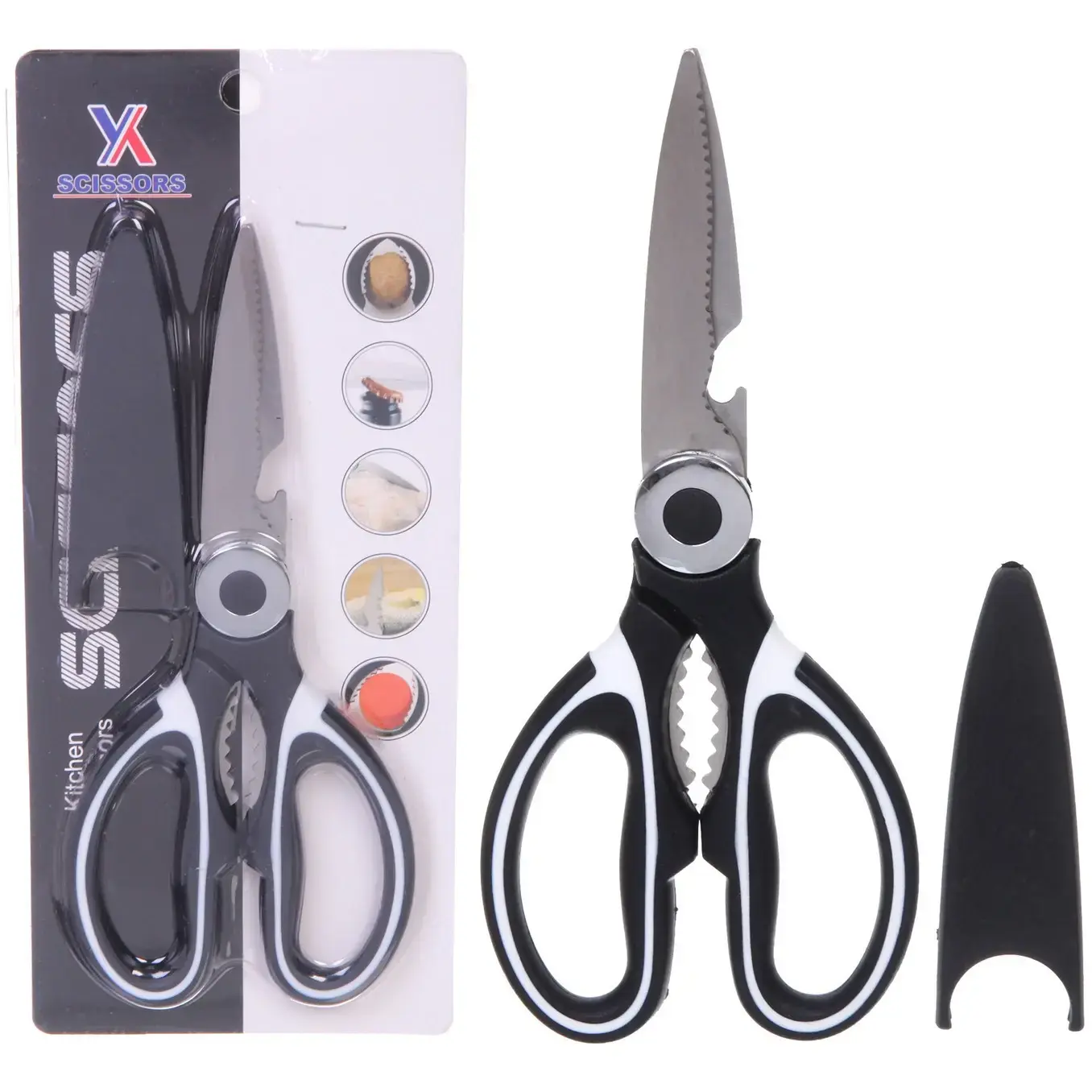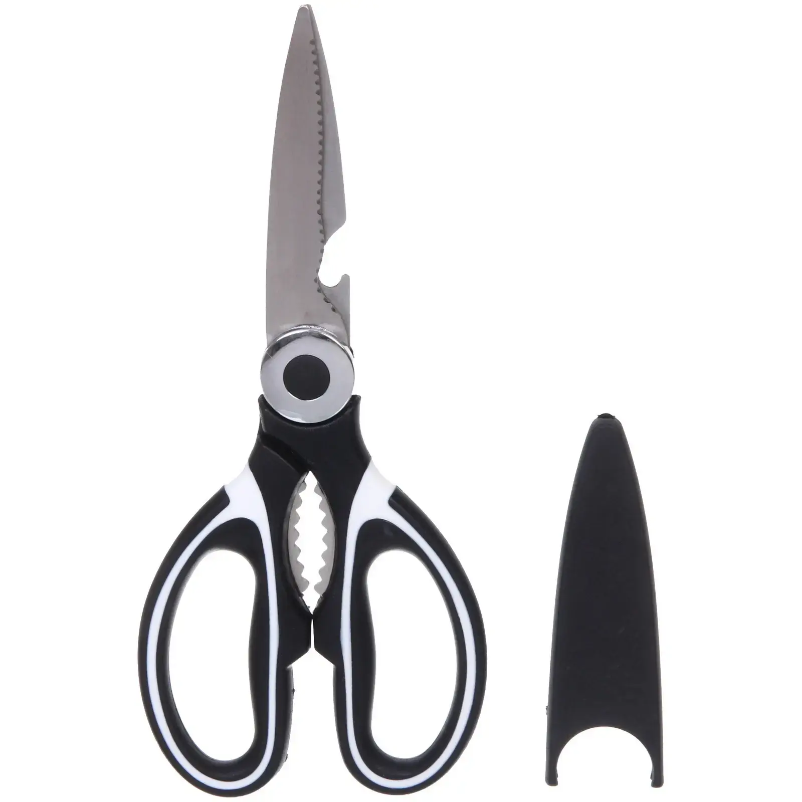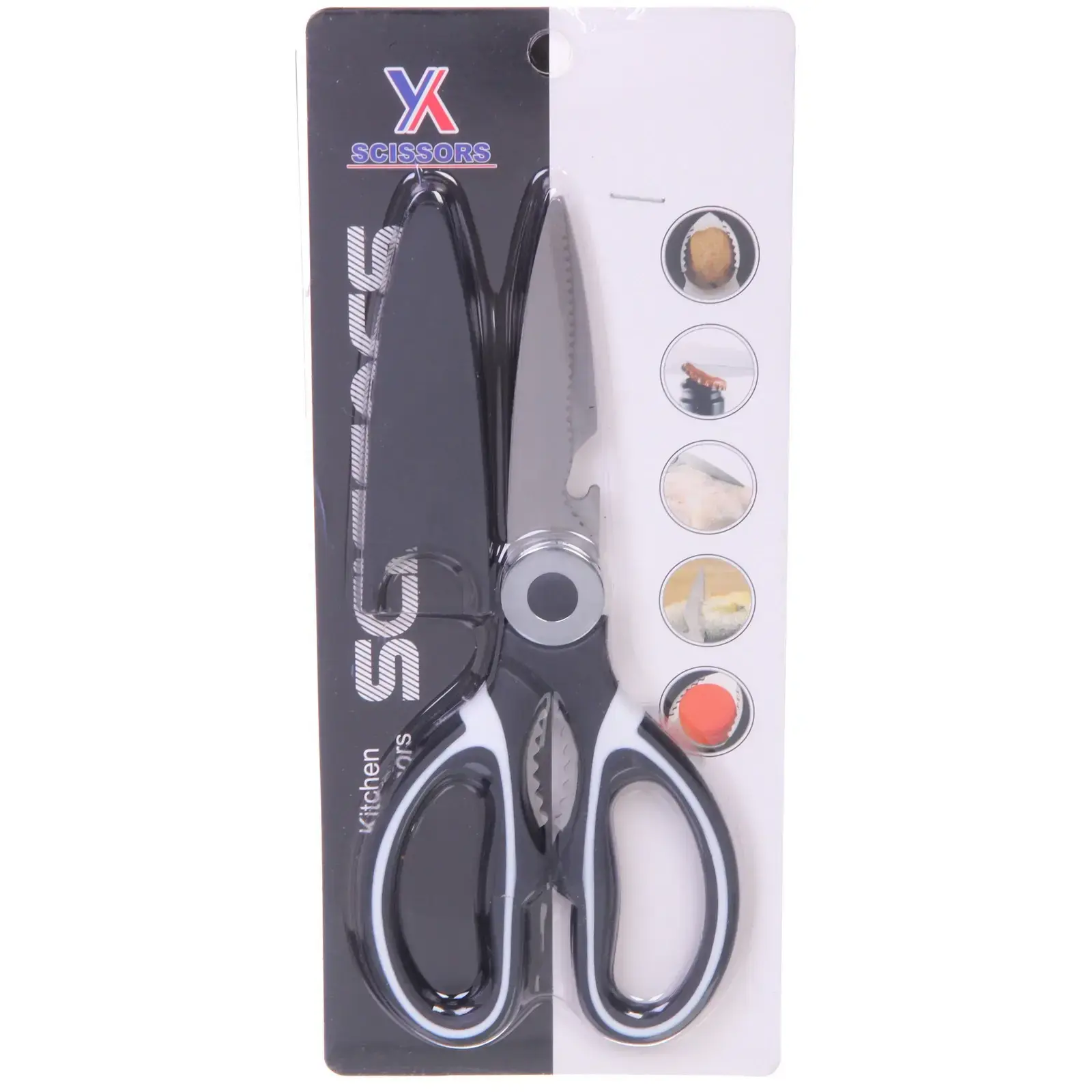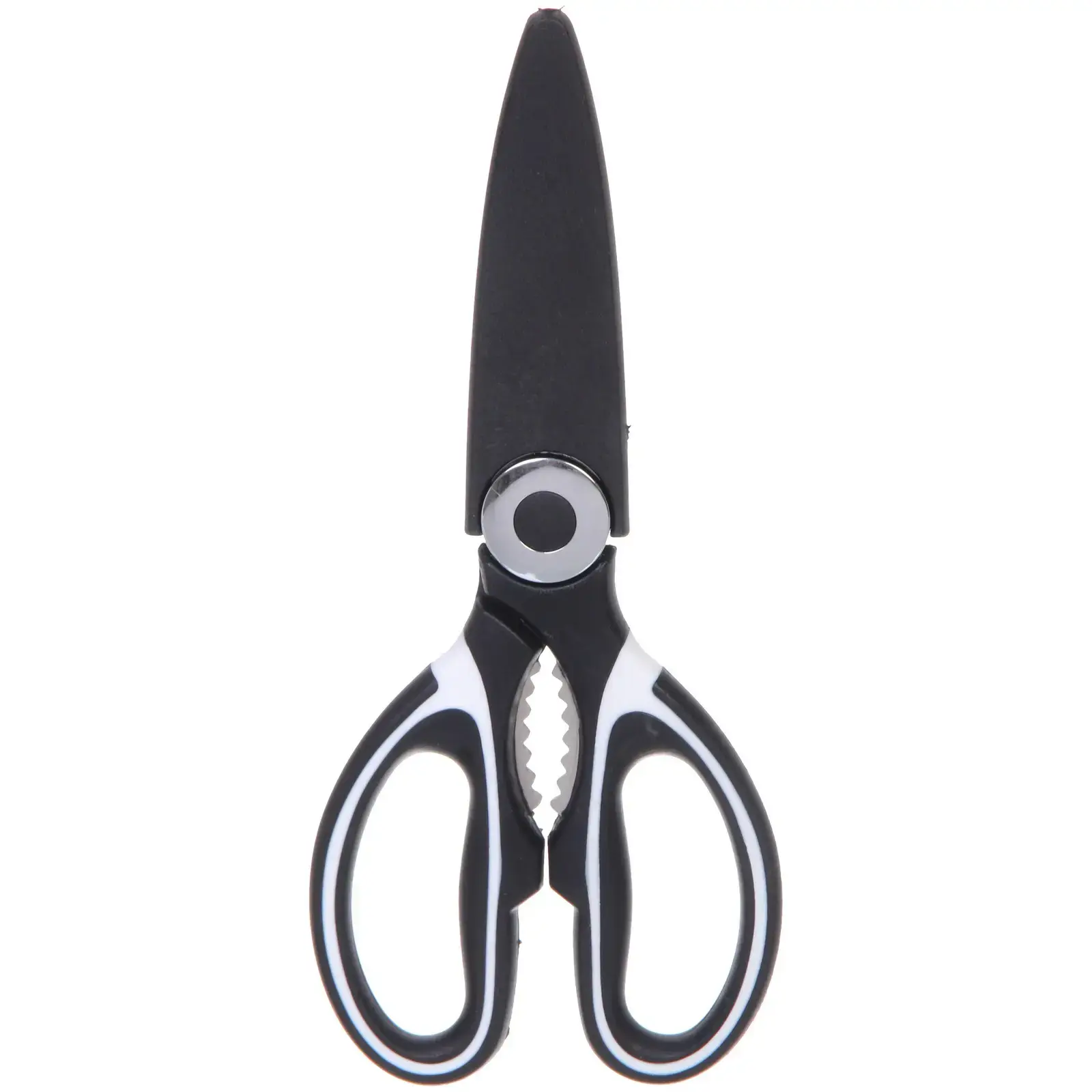 Ножницы выполнены из металла и пластика, что обеспечивает их легкость и прочность. Черный цвет с белыми вставками придает им стильный вид, а эргономичный дизайн ручек делает их удобными в использовании. Размеры ножниц стандартные для кухонных инструментов, что позволяет легко хранить их в любом кухонном ящике или на полке.