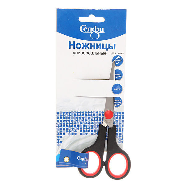 Ножницы выполнены из металла и пластика, что обеспечивает их прочность и долговечность. Черные ручки с красными вставками не только стильные, но и удобные для захвата. Упаковка ножниц выполнена в синем цвете с белыми и черными элементами дизайна, что делает их привлекательными для покупателя. Ножницы имеют маркировку, указывающую на их универсальность и предназначение для резки различных материалов.