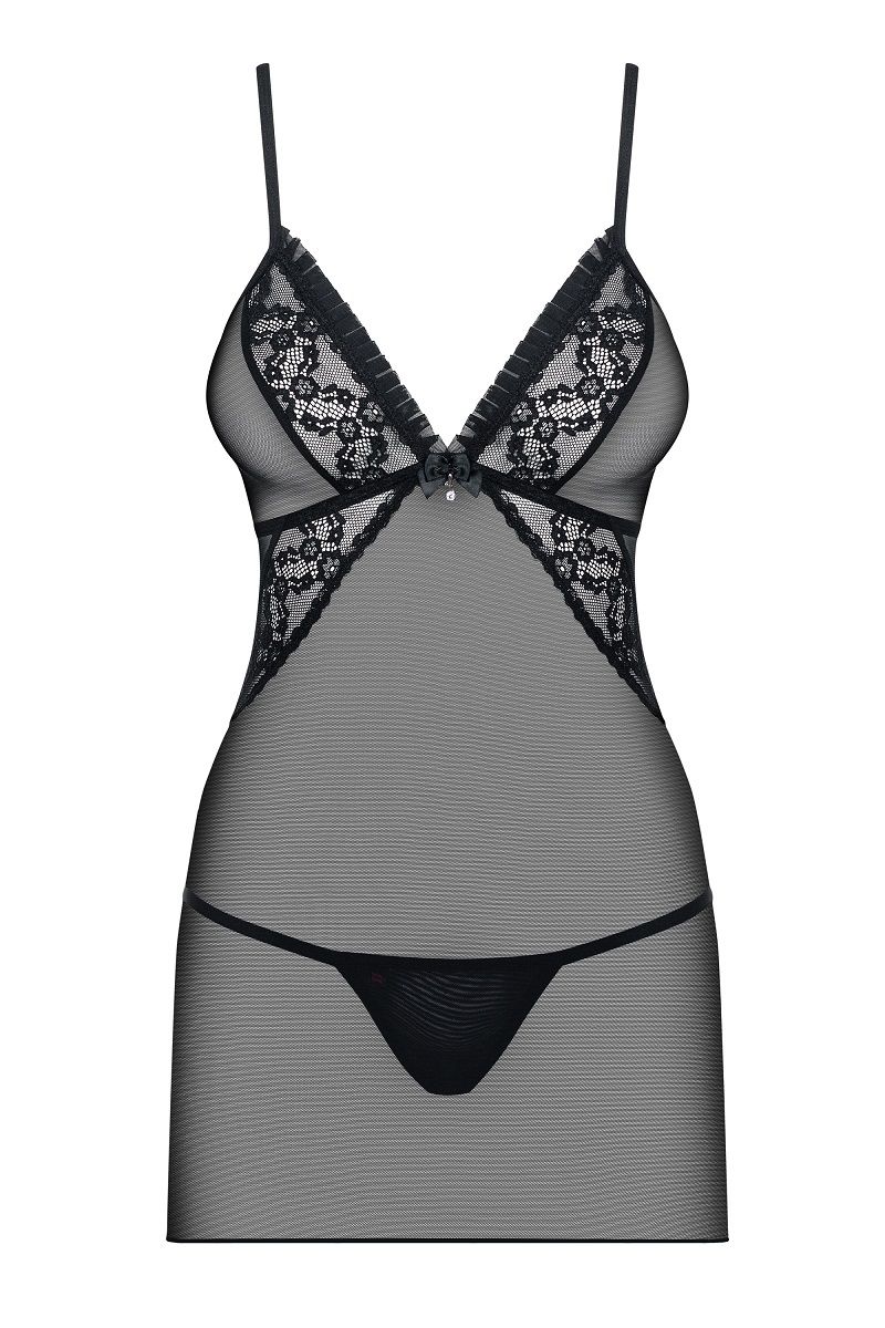 Вместе с сорочкой вы получаете трусики-стринги в тон, что избавляет от необходимости подбирать нижнее бельё отдельно. Комплект готов к использованию и создаёт гармоничный ансамбль.