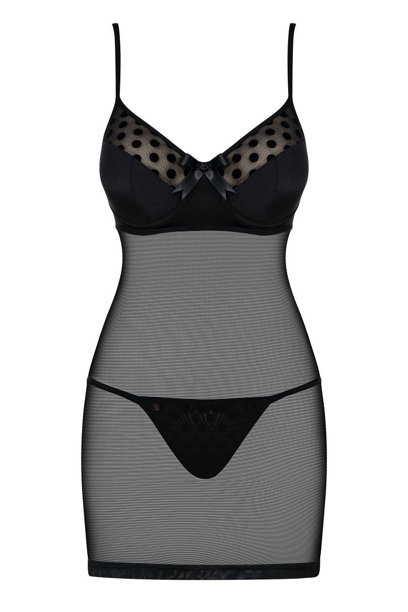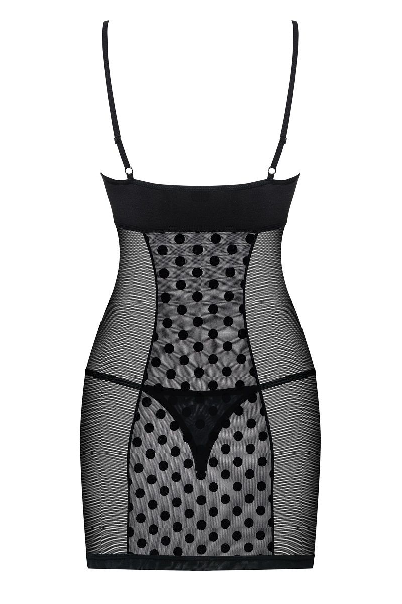 Облегающая сорочка в горошек создана для того, чтобы подчеркнуть вашу женственность и создать неповторимую атмосферу интимной близости. Сочетание полупрозрачной сетки и игривого горохового принта делает этот комплект одновременно дерзким и элегантным, идеальным для романтического вечера.