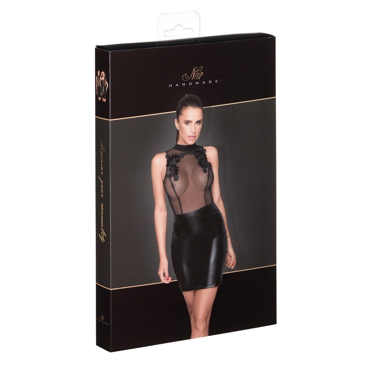 Платье без рукавов подходит для вечерних выходов, клубных мероприятий или романтических свиданий. Верхняя часть выполнена из мягкого фатина с очаровательным вырезом на спине, застегивающимся на две маленькие пуговицы, что добавляет нотку игривости. Юбка из эластичного материала wet-look обтягивает фигуру и имеет небольшой разрез сзади, что делает образ еще более привлекательным.