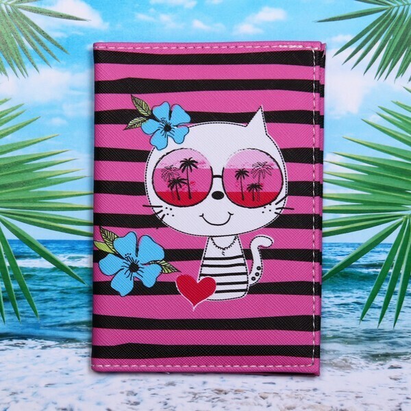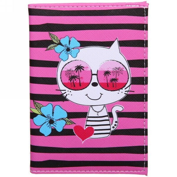 Планируете путешествие или просто хотите надежно защитить свой паспорт от износа? Эта обложка сочетает оригинальный дизайн с функциональностью, чтобы ваши документы выглядели аккуратно даже при частых поездках. Контрастные черно-розовые полосы и мультяшная кошка с очками создают настроение отпуска: такой аксессуар приятно держать в руках, а благодаря позитивному оформлению его всегда легко найти в сумке.