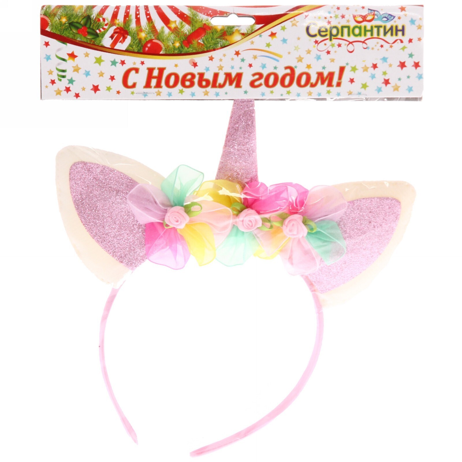 Ободок карнавальный «Единорог Принцесса» с рогом, цветами и ушками, розовый, пластик/текстиль
