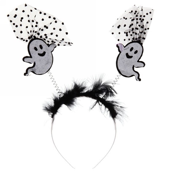 Ободок выполнен в черном цвете и украшен декоративными элементами в виде улыбающихся привидений серого цвета. Эти призраки, выполненные из черной сетчатой ткани с белыми точками, закреплены на пружинах, что позволяет им слегка колебаться и придавать вашему образу динамичность. Ободок подходит для людей всех возрастов и станет отличным дополнением к любому карнавальному костюму.