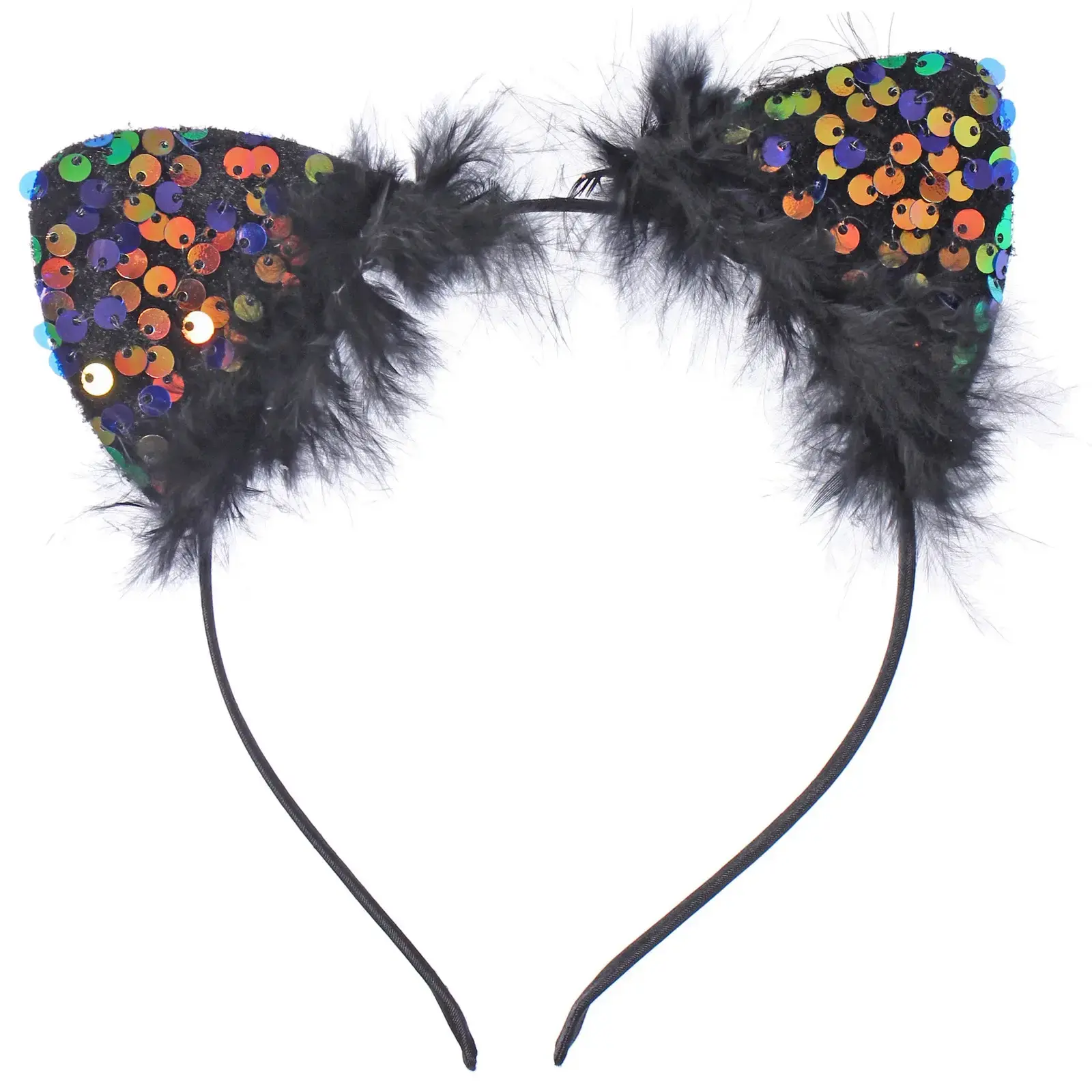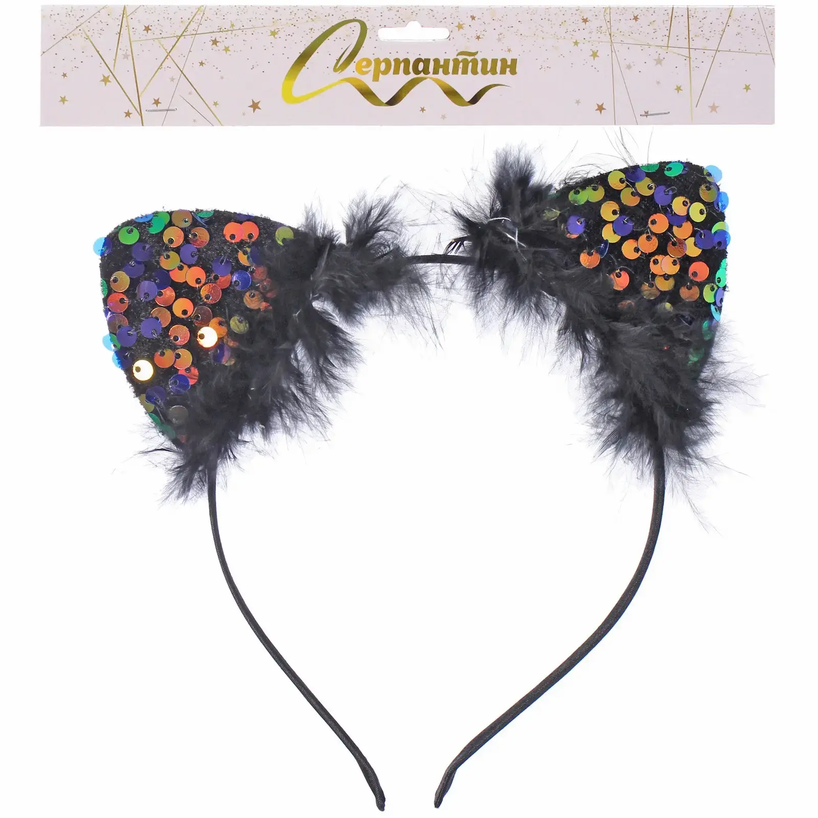 Ободок имеет черный цвет и украшен разноцветными блестящими пайетками, которые переливаются на свету, привлекая внимание окружающих. Пушистая отделка из искусственного меха добавляет игривости и делает аксессуар еще более привлекательным. Ушки имеют треугольную форму, напоминающую кошачьи, что делает их идеальными для создания игривого и веселого образа.
