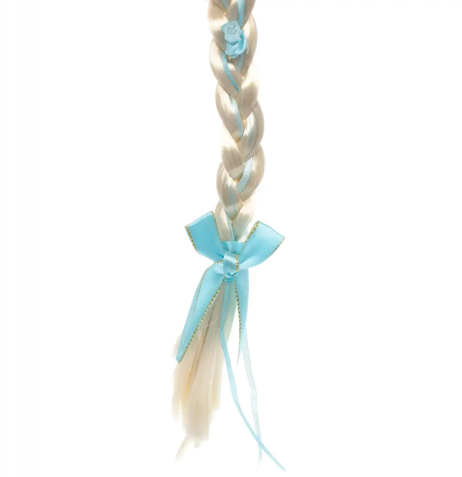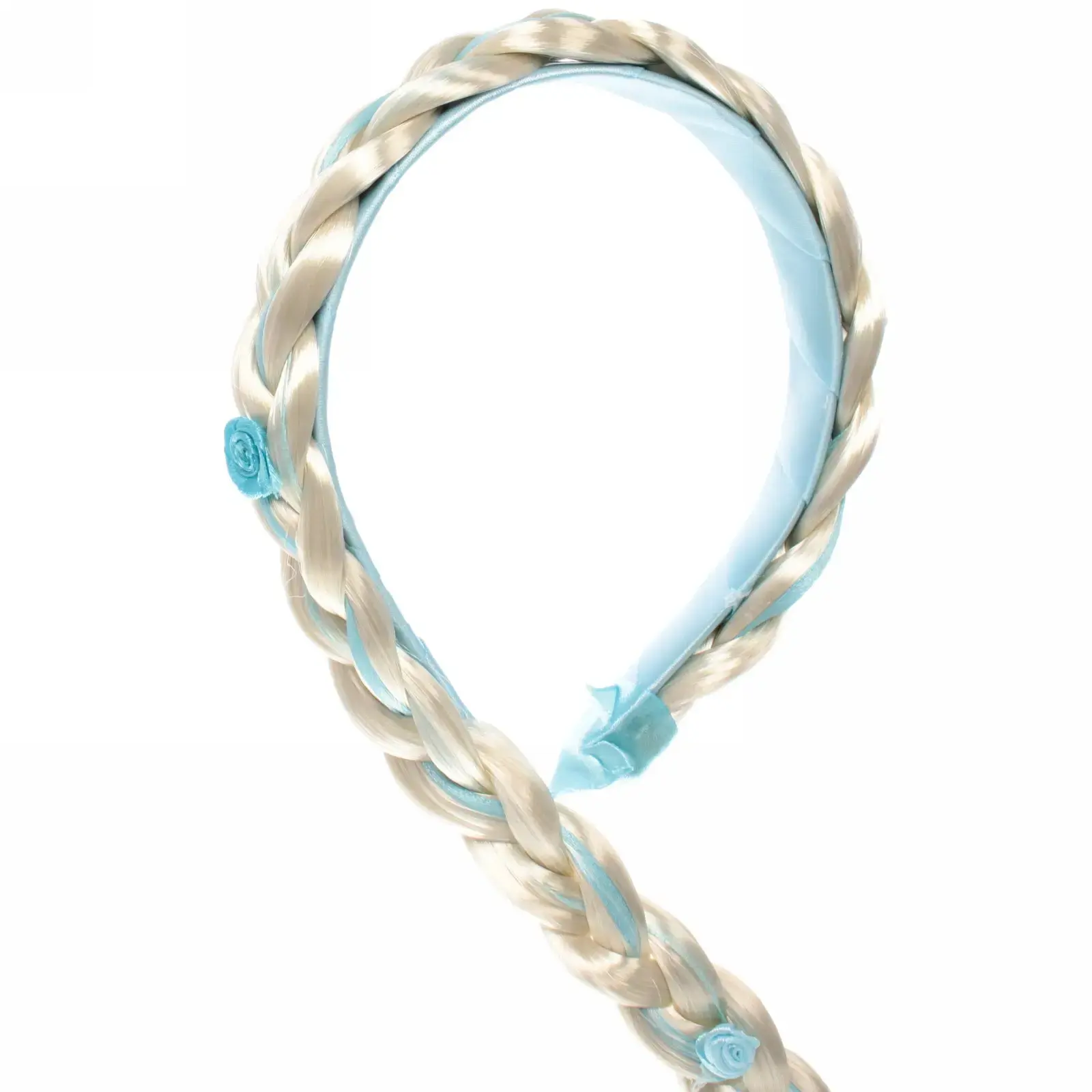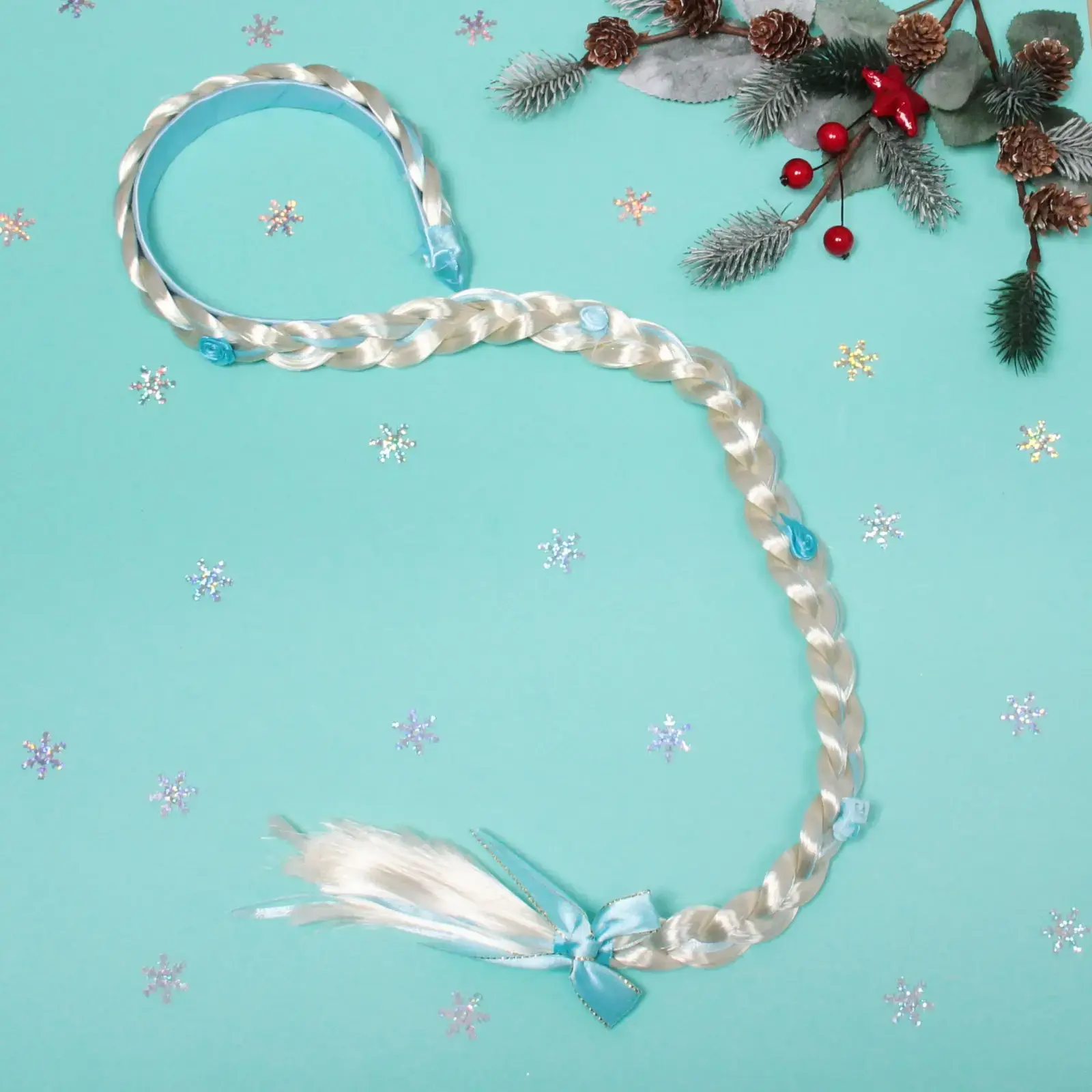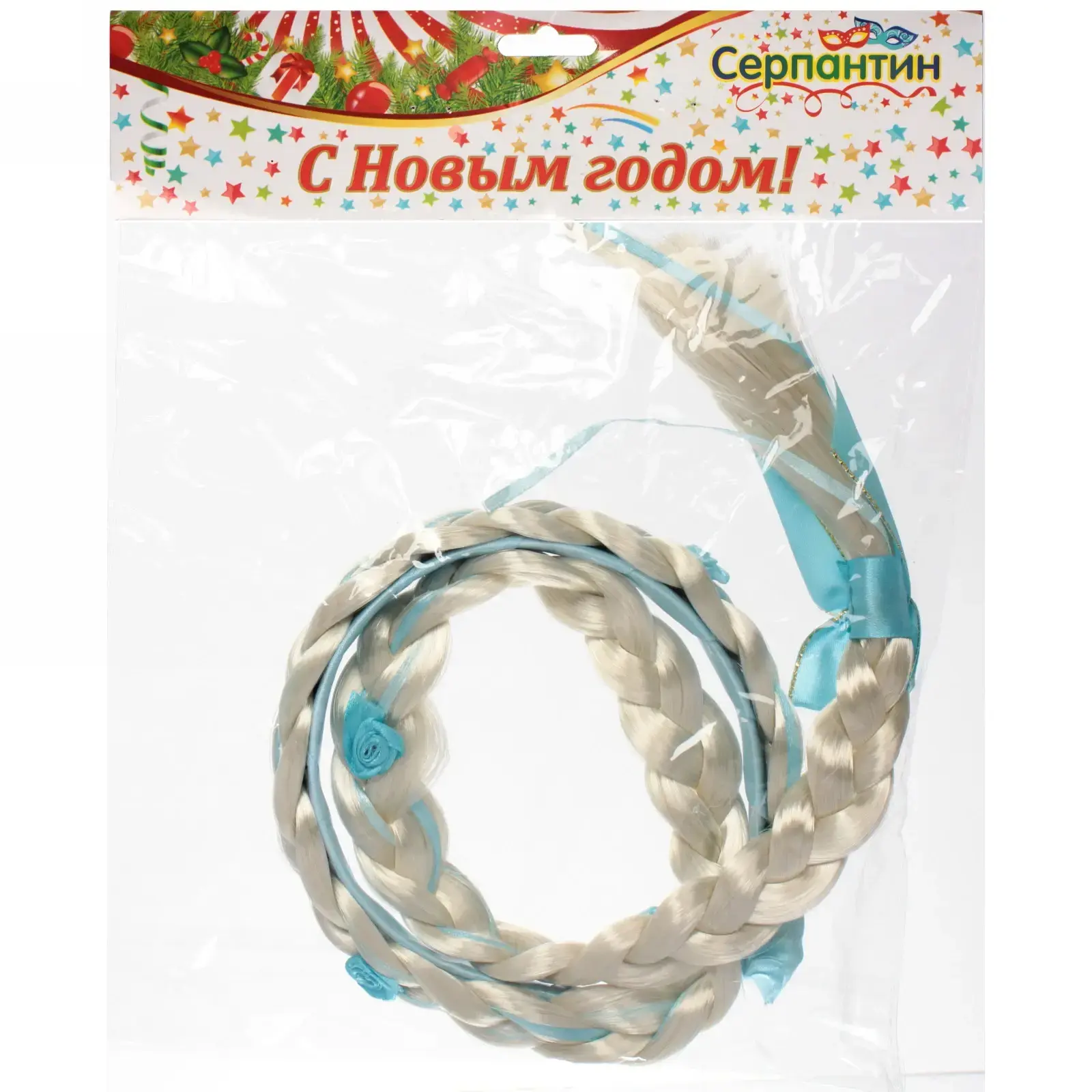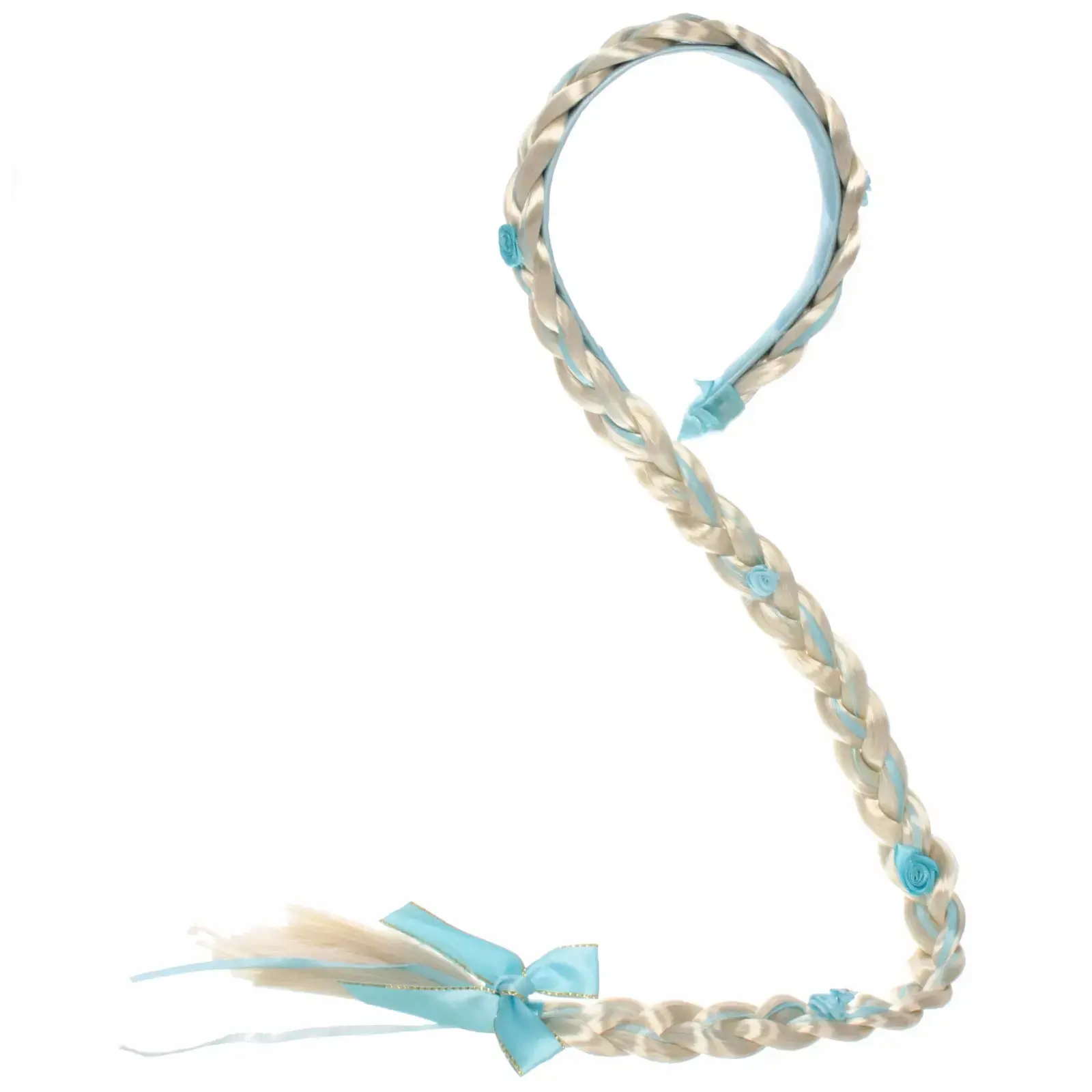 Ободок украшен длинной светлой косой с голубыми бантиками и цветочными элементами, что создает нежный и воздушный образ. Материалы (пластик и текстильные волокна) обеспечивают комфортное ношение в течение всего праздника.