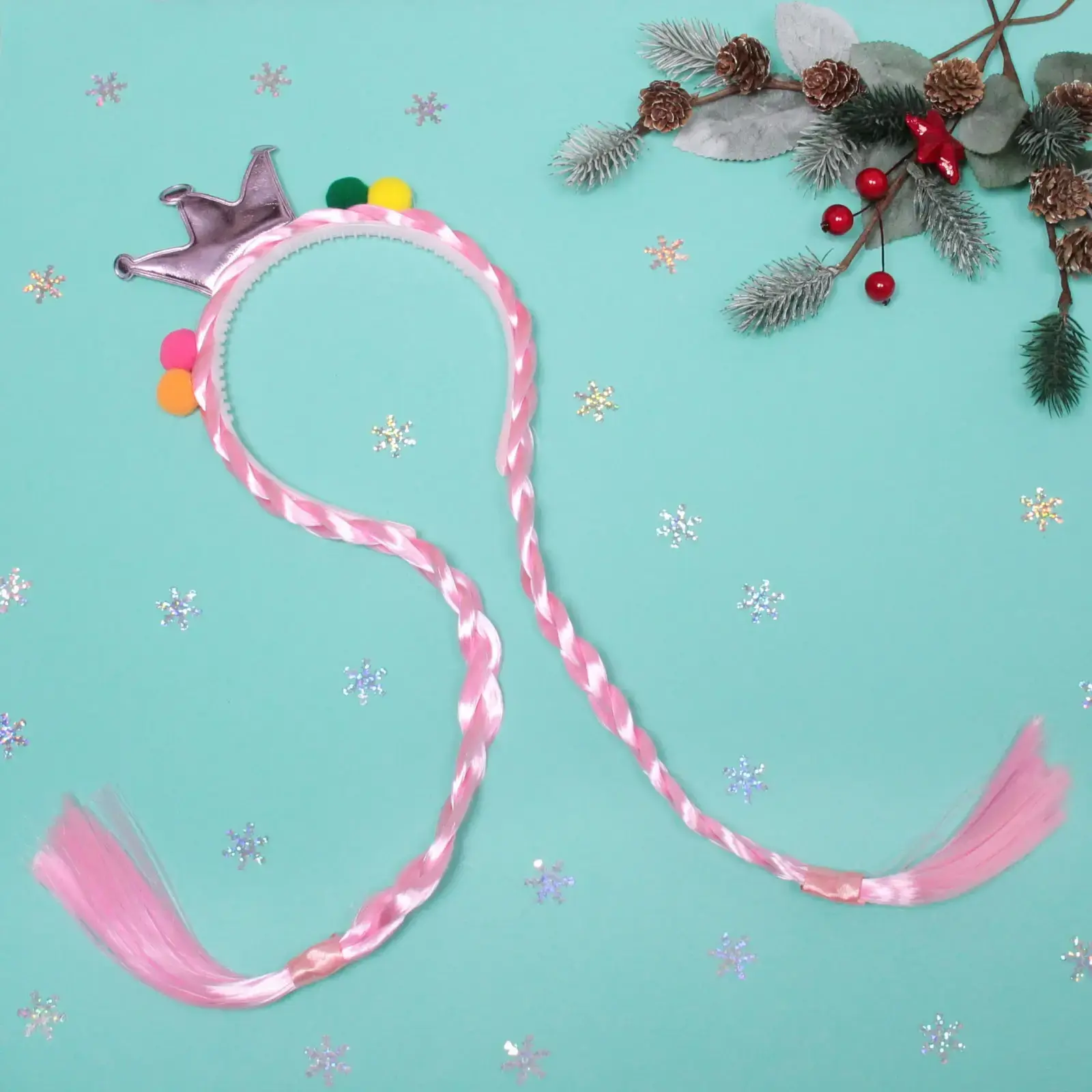 Ободок предназначен для девочек и отлично подходит для использования на детских праздниках. Он легко надевается и обеспечивает комфортное ношение благодаря своей легкой конструкции. Декоративные элементы, такие как цветные помпоны, добавляют игривости и яркости, что делает его привлекательным для детей.