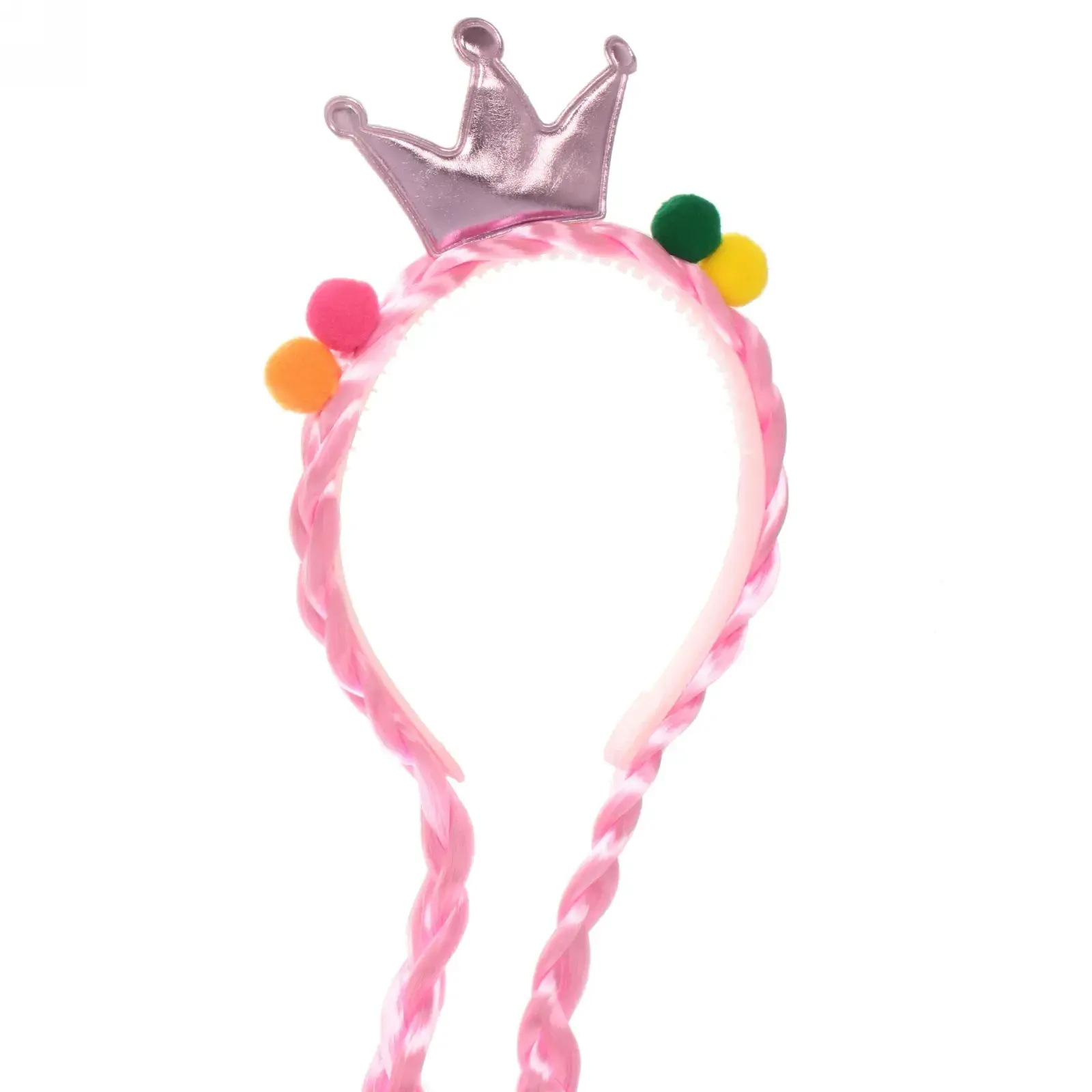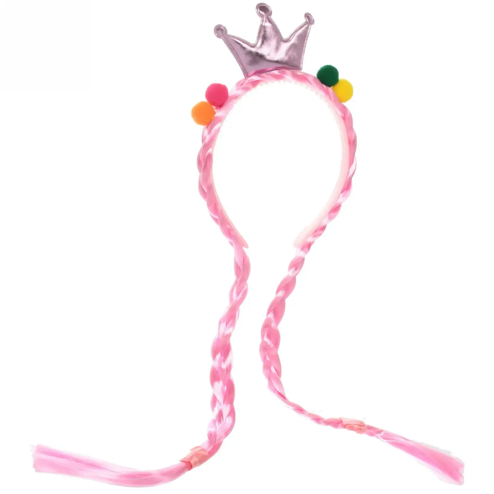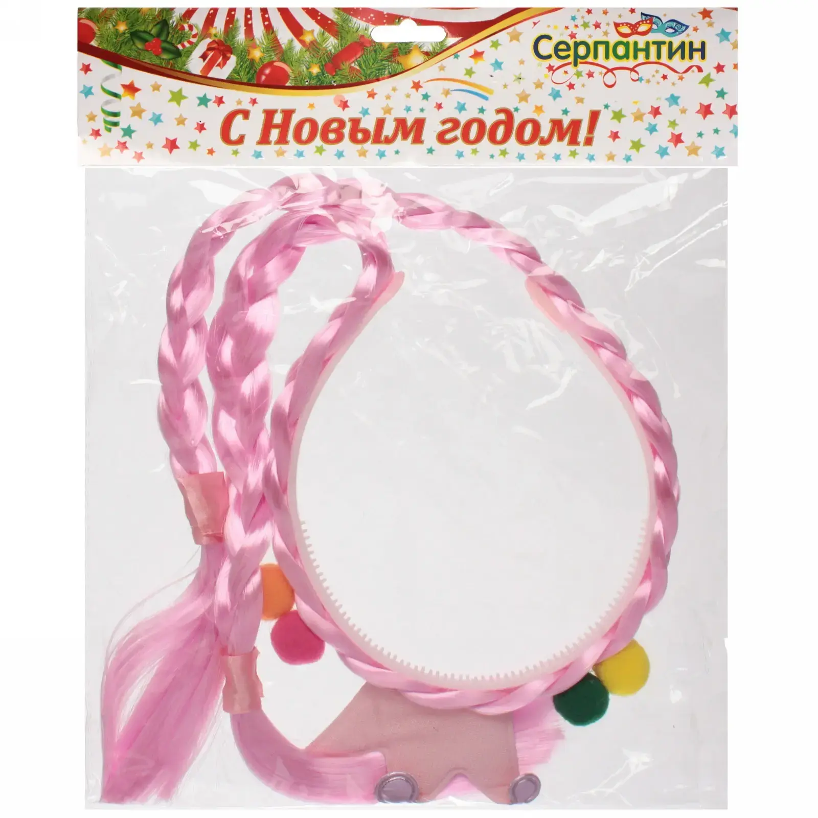 Ободок имеет стандартный размер, подходящий для детей, и украшен длинными заплетенными косичками, которые добавляют объем и выразительность. Цветные помпоны (желтый, зеленый и красный) расположены по бокам, создавая яркий и праздничный вид. Этот аксессуар станет отличным дополнением к любому костюму и поможет вашему ребенку выделиться на празднике.