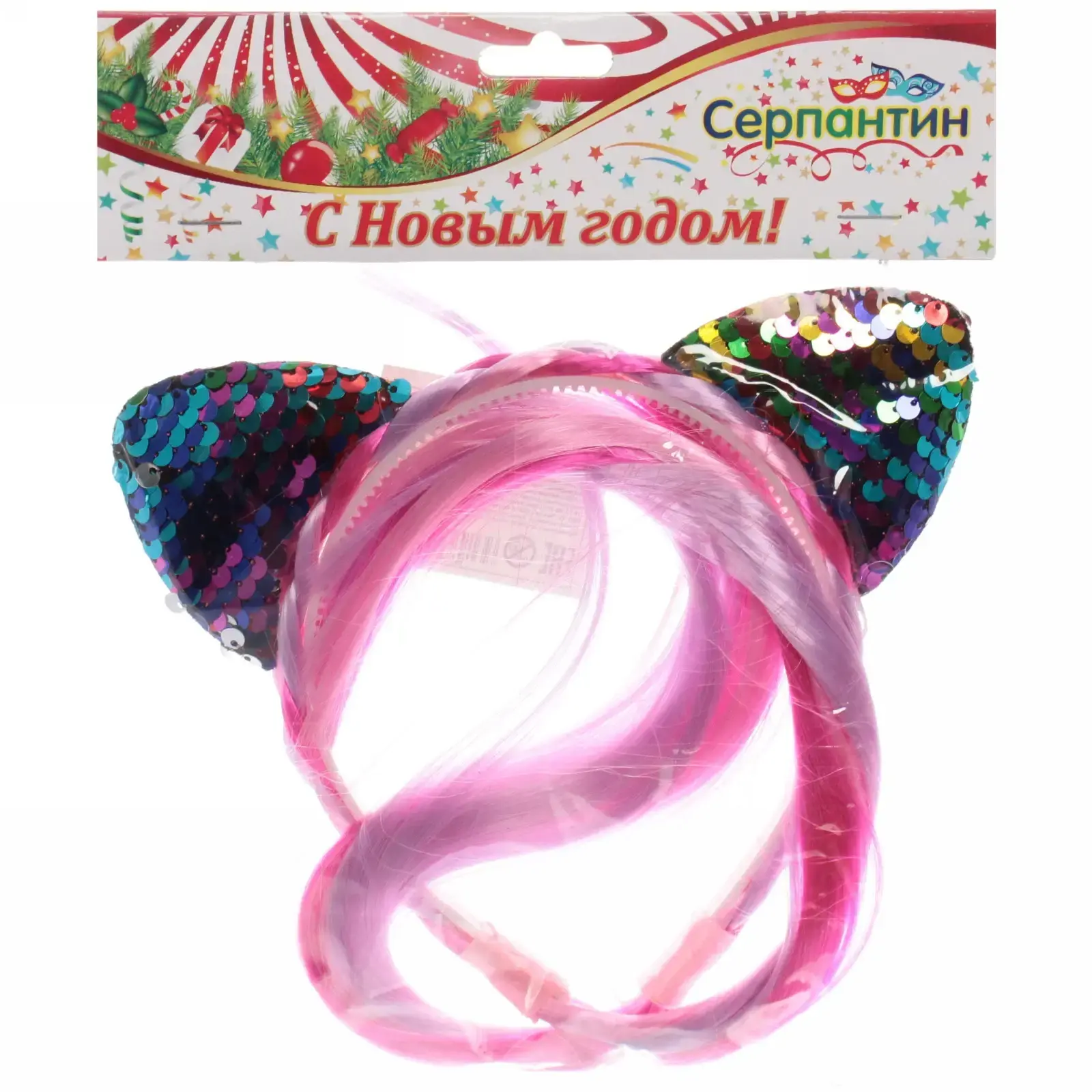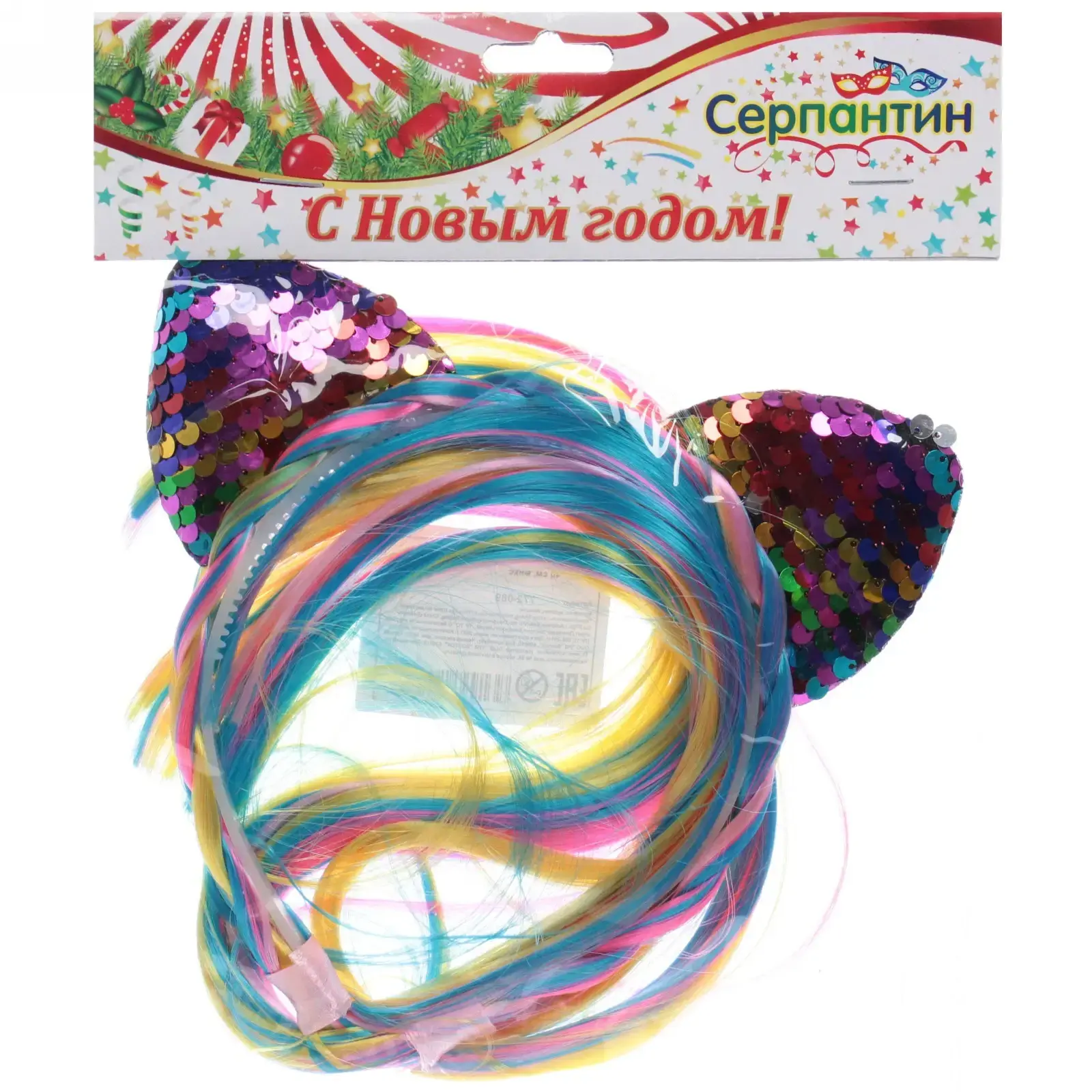 Размер ободка составляет 40 см, что делает его универсальным для большинства пользователей. Уши ободка имеют форму кошачьих и украшены блестящими пайетками, что придает им игривый вид. Длинные пряди волос, прикрепленные к ободку, добавляют объем и стиль. Ободок упакован в яркую упаковку с надписью «С Новым годом!», что делает его отличным подарком для друзей и близких.
