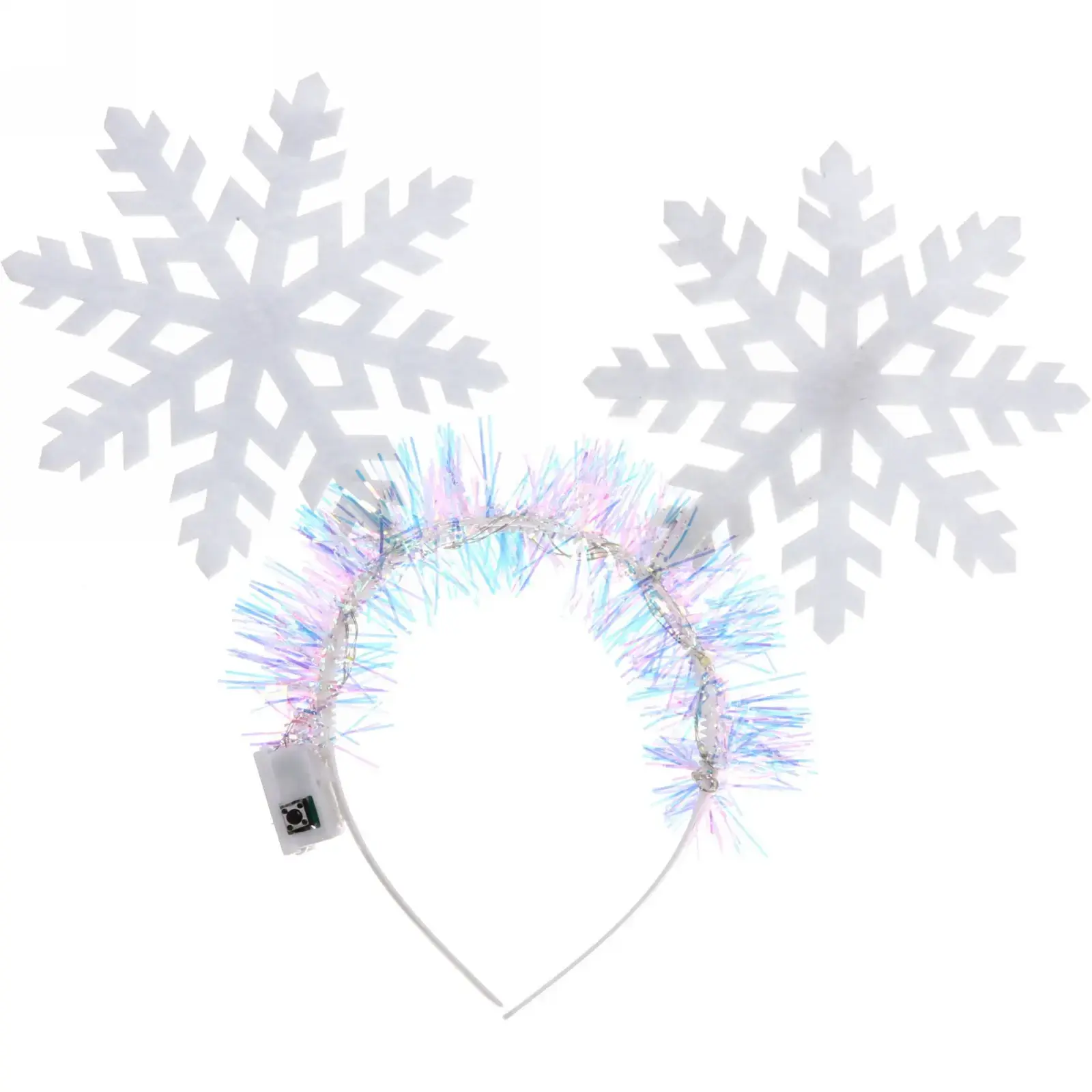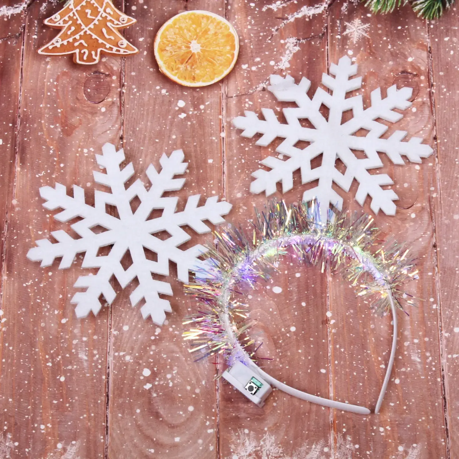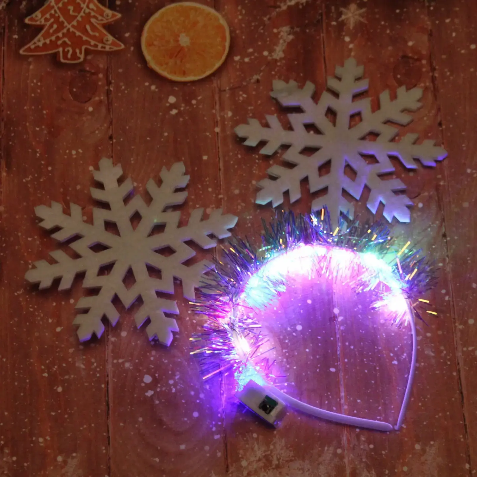 Легкий ободок с подсветкой превратит любой наряд в сказочный атрибут зимнего праздника. Симметричные снежинки с разноцветной подсветкой создают эффект живого мерцания, а прочная конструкция гарантирует комфорт даже при длительном ношении.