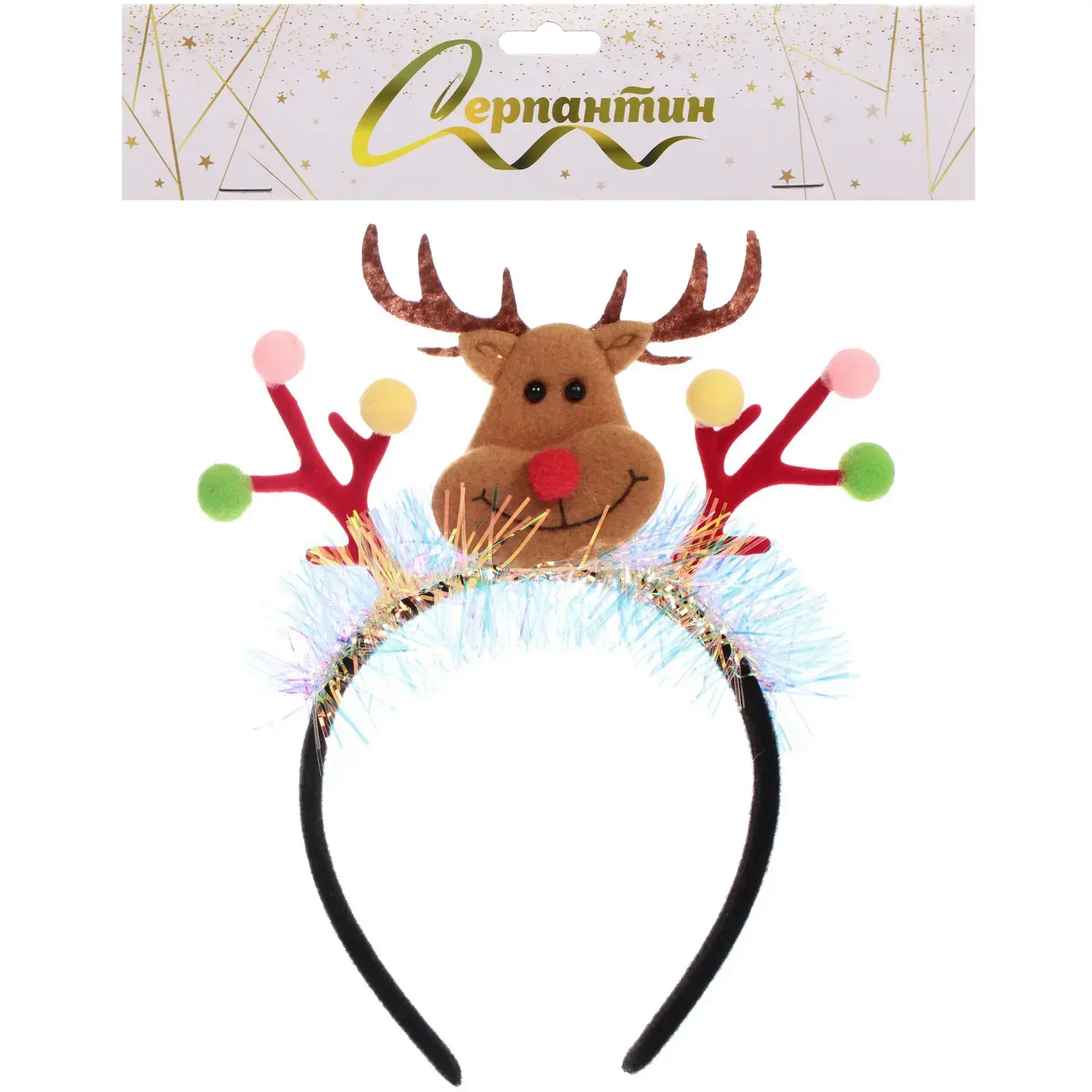 Ободок имеет черный цвет, что делает его универсальным аксессуаром, подходящим к любому наряду. Декор включает в себя фигурку оленя с красным носом и черными глазками, а также разноцветные помпоны, которые добавляют яркости. Этот ободок станет отличным дополнением к вашему новогоднему образу и поможет создать атмосферу веселья и радости.