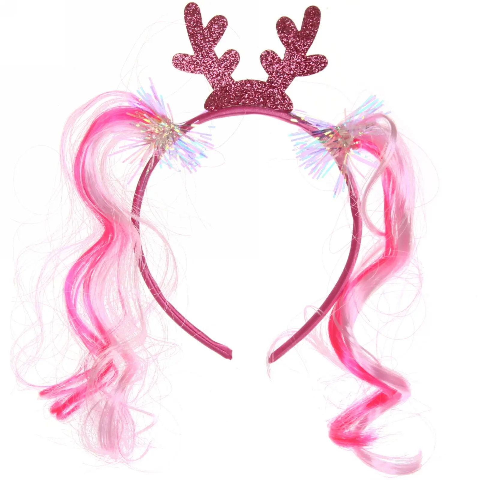 Ободок выполнен из качественных материалов: ПВХ и пластика, что обеспечивает его долговечность и легкость. Яркий розовый цвет и блестящие элементы делают его привлекательным для детей и взрослых. Локоны, выполненные в розовом и белом цветах, придают дополнительный объем и создают эффектный вид. Благодаря стандартному размеру, ободок подходит для большинства голов.