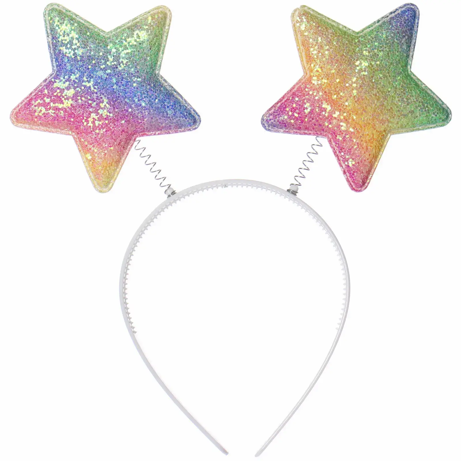 Ободок выполнен из белого пластика, а звёзды имеют радужные цвета с блестящим покрытием. Размер звёзд не указан, но они выглядят внушительно и привлекают внимание. Этот аксессуар станет отличным дополнением к вашему праздничному образу и поможет создать настроение веселья и радости.