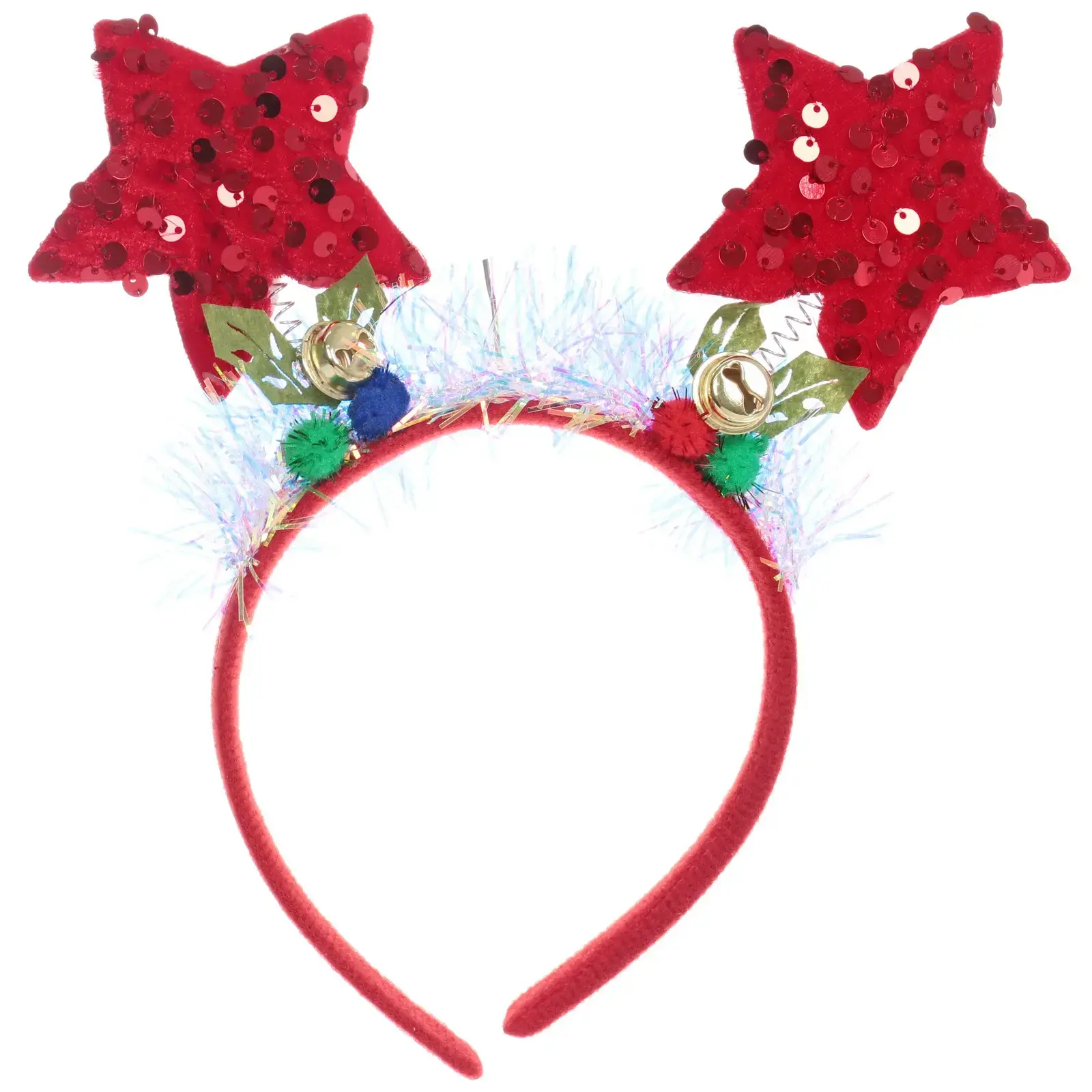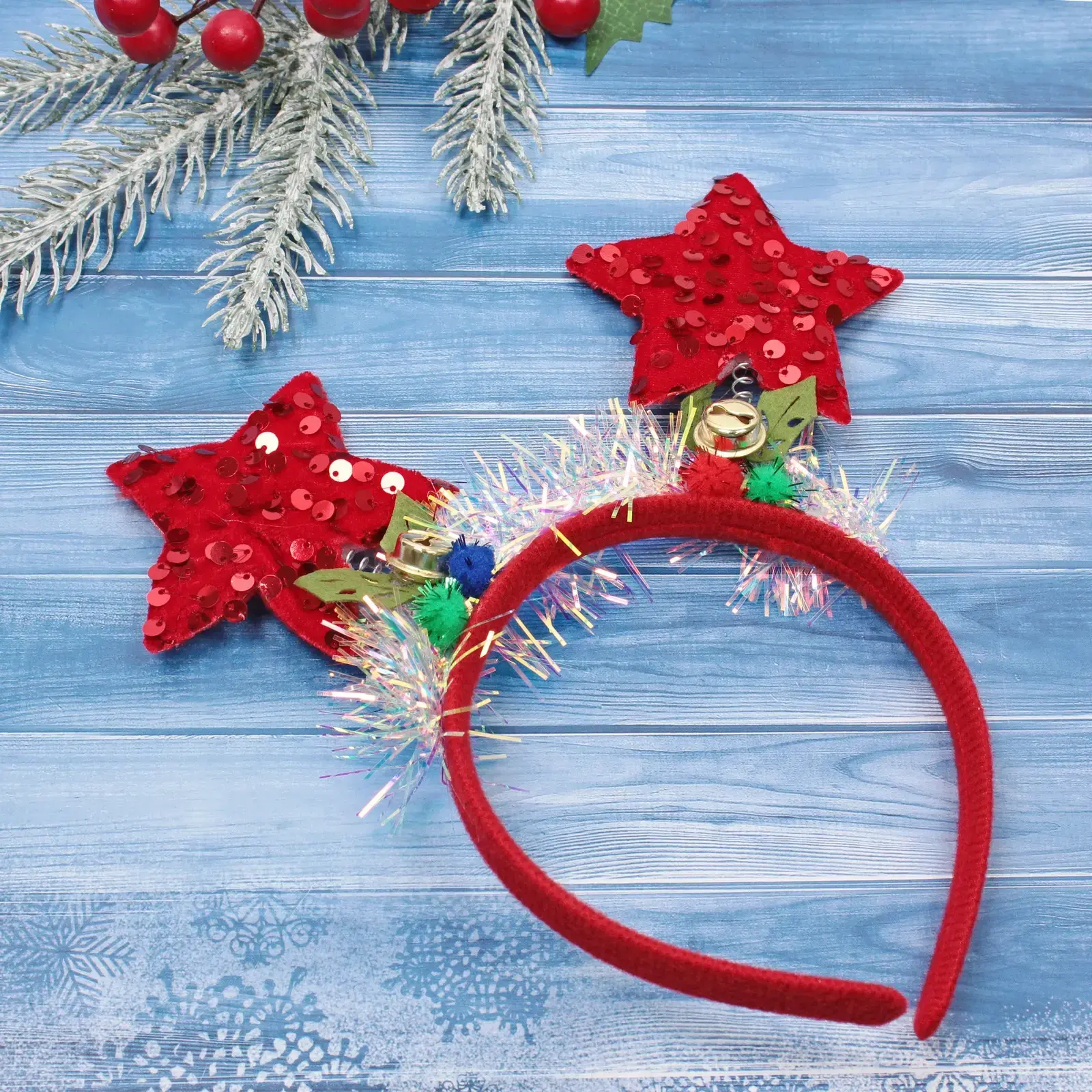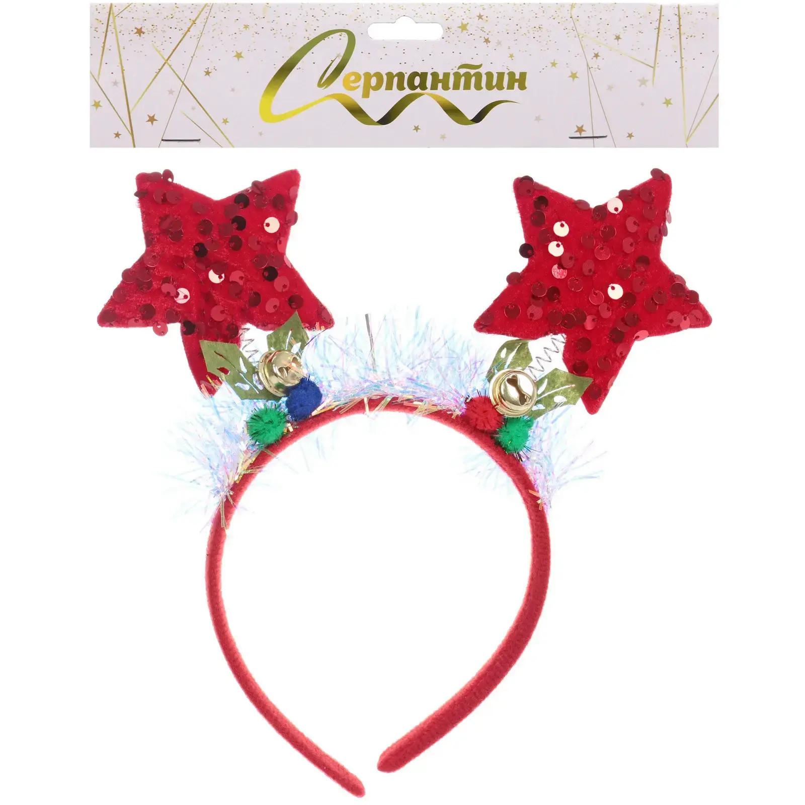 Ободок выполнен из качественного пластика и текстиля, что обеспечивает его долговечность. Декоративные элементы, такие как блестящие звезды и колокольчик, добавляют оригинальности и создают праздничное настроение. Размеры ободка не указаны, но он имеет стандартную форму, подходящую для большинства голов.