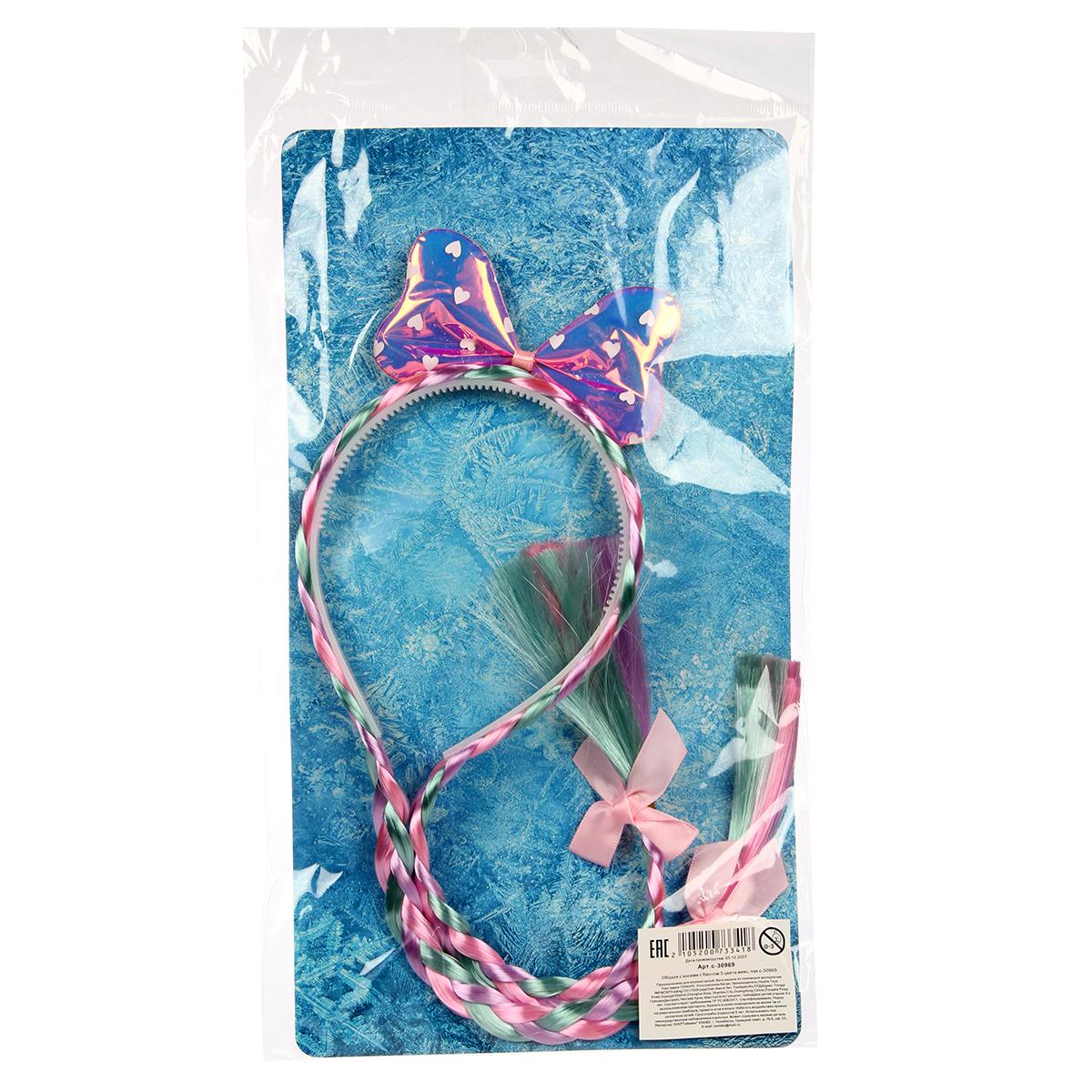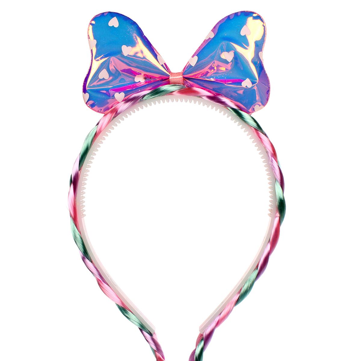 Ободок выполнен в светлом цвете с косичками из разноцветных материалов, создающих эффектную и яркую составляющую. Бантик оснащен голографической поверхностью в синих, розовых и фиолетовых оттенках, что придает аксессуару особую привлекательность. В комплект входят 3 варианта цветов — розовый, зеленый и синий — чтобы вы могли подобрать наиболее подходящий под ваш стиль.