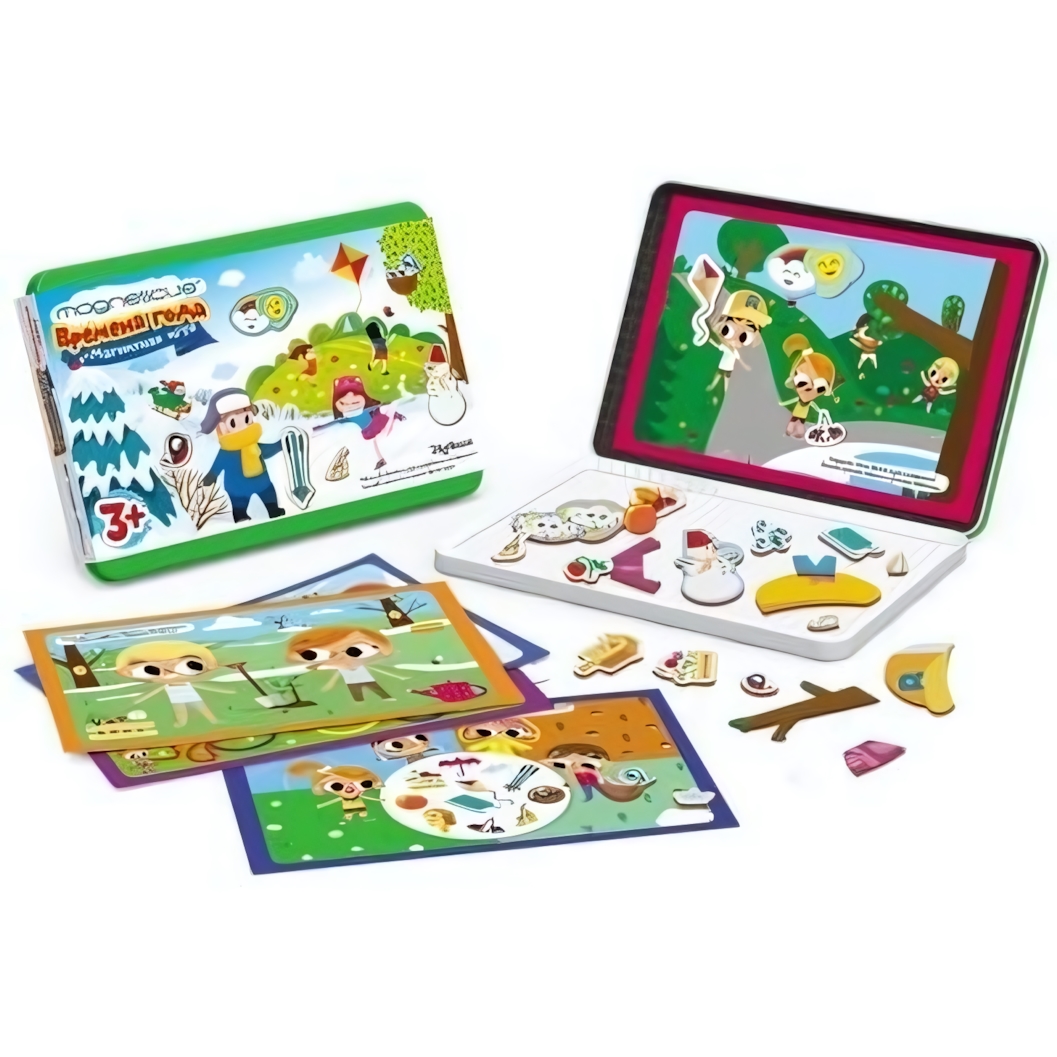 Игра идеально подходит для детей от 3 лет. С ее помощью ребенок научится сопоставлять изменения в природе с временами года, запомнит названия месяцев и поймет, как правильно одеваться в разную погоду. Компактный размер металлического кейса делает его незаменимым спутником в длительных поездках — магниты крепко держатся на поверхности, что позволяет играть даже в движущемся транспорте.