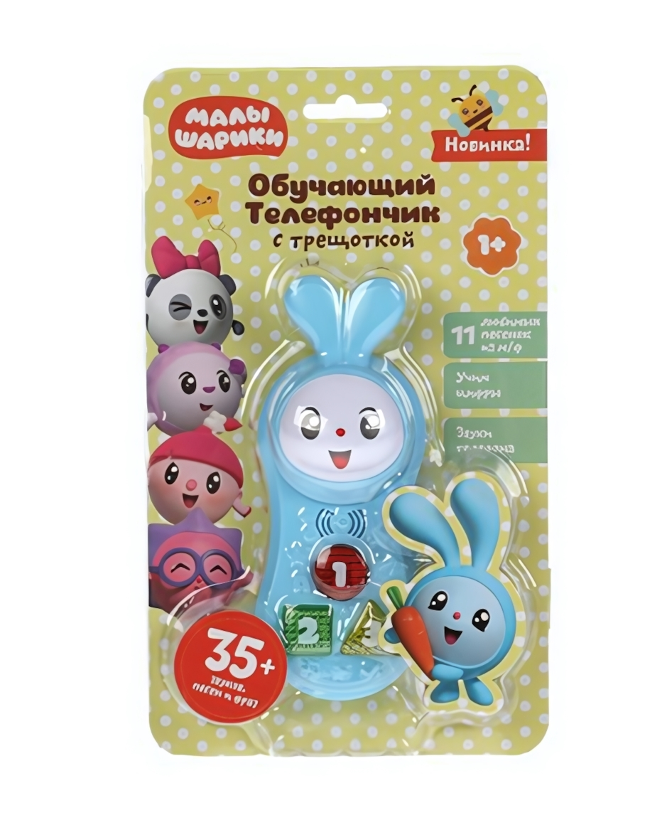 Обучающий телефончик «малышарики» с трещоткой – 35 песен, цифры, звуки, 5×10×2 см, голубой зайчик, от 1 года