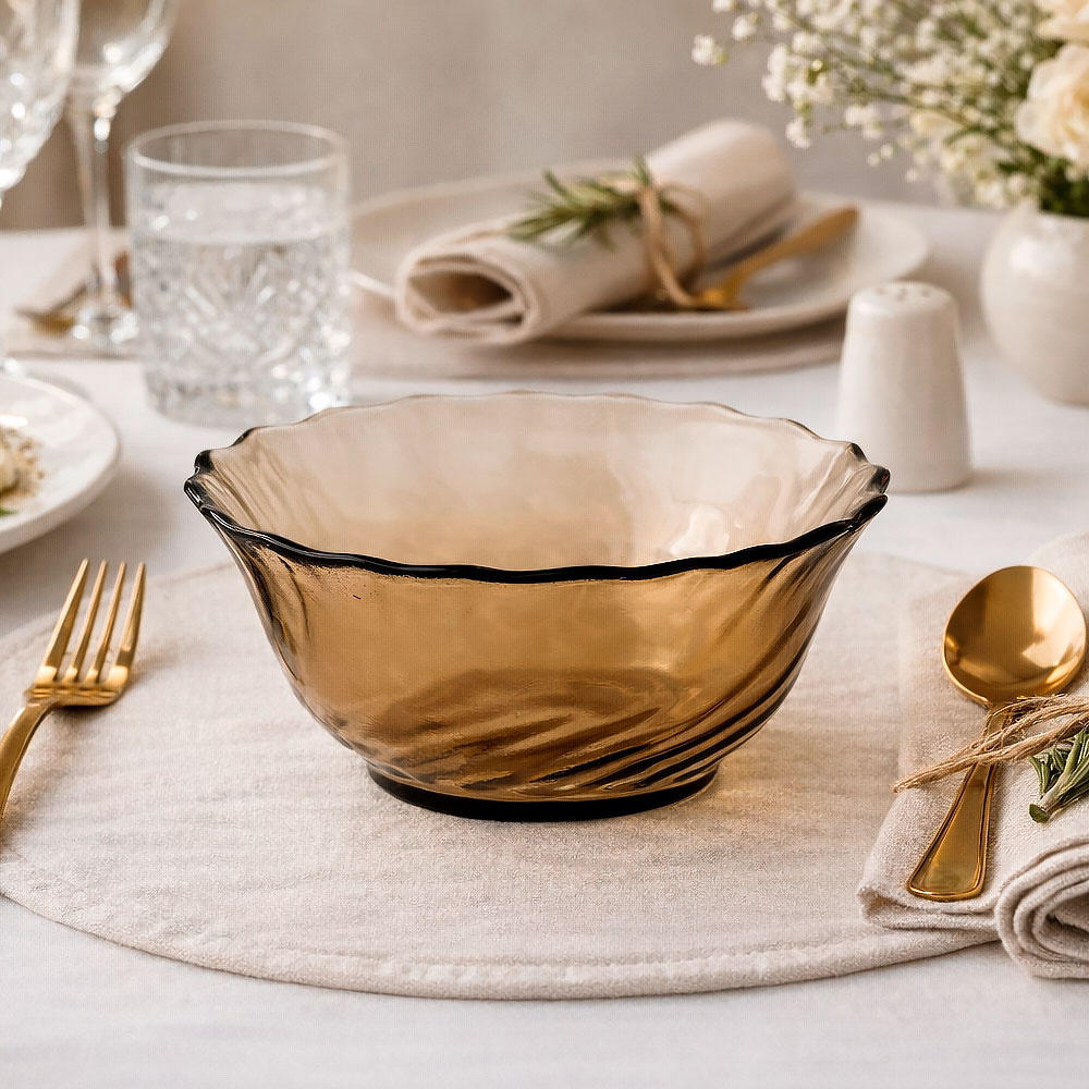 Погрузитесь в атмосферу уюта с компактным салатником, который моментально привлекает внимание своим дизайнерским исполнением. Рельефная поверхность и волнистый край создают особое ощущение комфорта, а полупрозрачный коричневый цвет с чёрной каймой добавляет столу стильный акцент. Такой салатник станет изюминкой вашей сервировки и подчеркнёт индивидуальность интерьера.